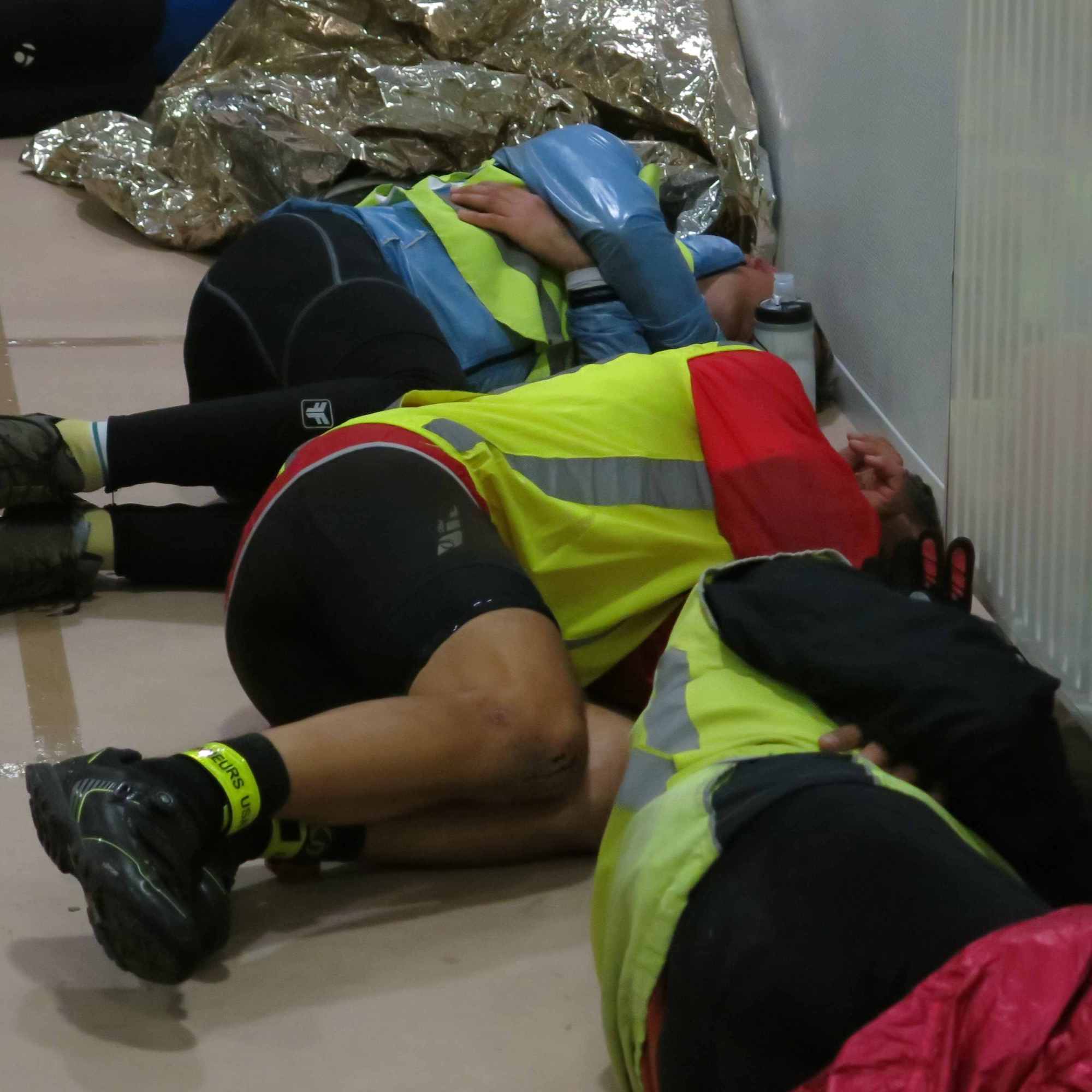 Überall liegen vor dem Versorgungspunkt Randonneure in Rettungsdecken gewickelt herum. Auch drinnen vor dem WC oder im Restaurant sieht man Schlafende, die gerade dort liegengeblieben sind, wo die Müdigkeit sie dahin gerafft hat.