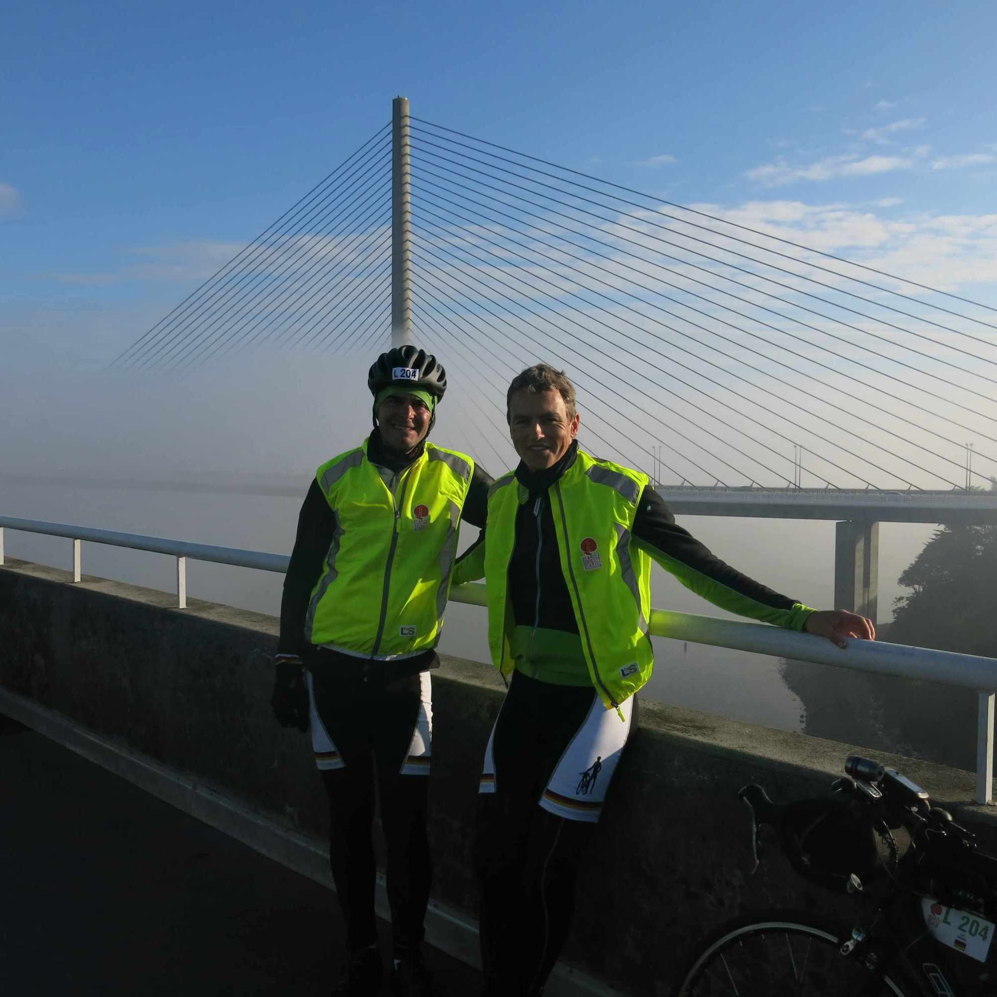 Mit einem erstaunlich guten Tempo rollen wir zum großen Teil sanft abwärts und dann sehen wir nach ein, zwei kleinen Rampen plötzlich vor uns die Pylone der Brücke nach Brest hinüber.