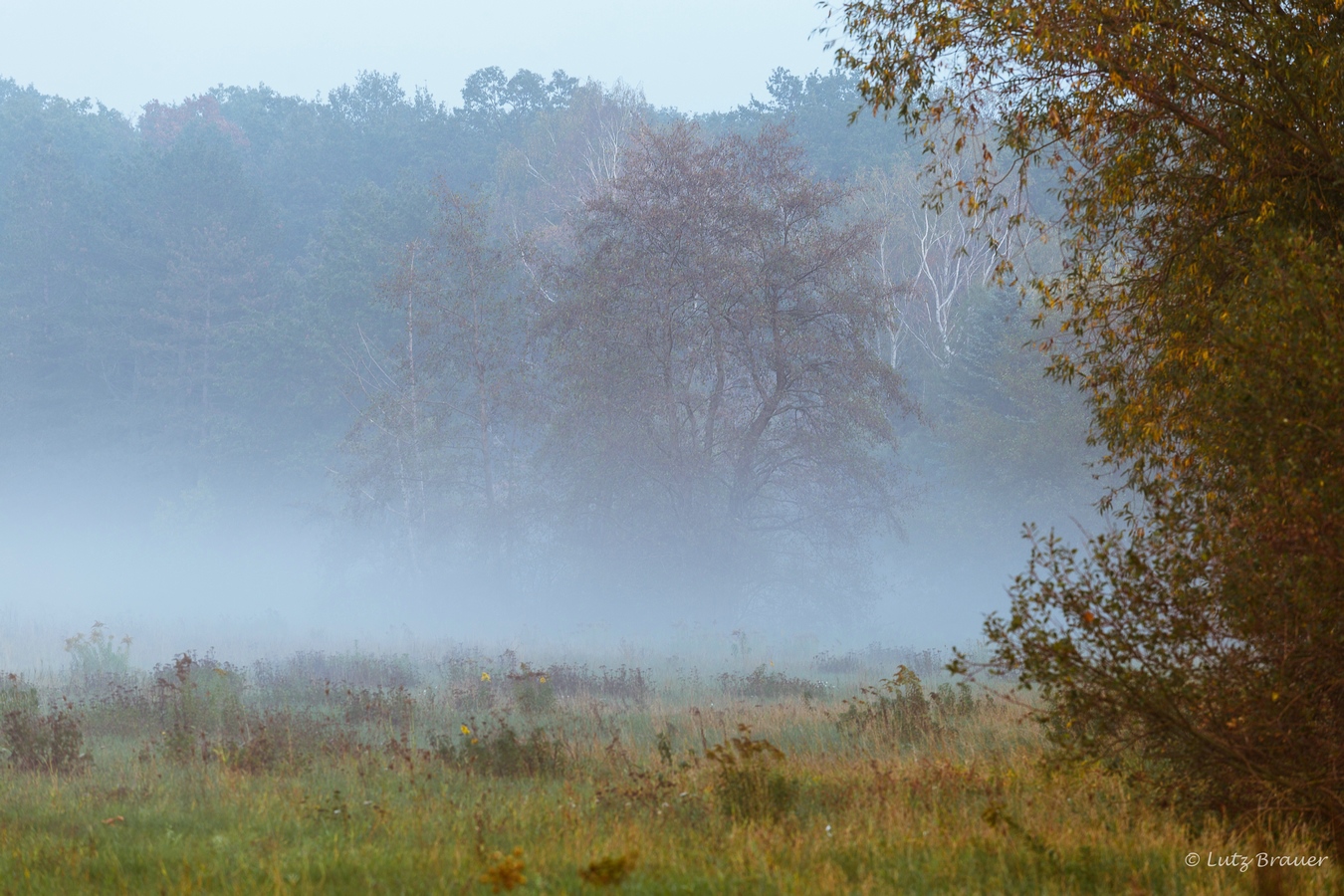 Unmerklich haben sich die flachen Nebelfelder verdichtet, diffus wabert weißlich-grauer Dunst über die Wiesen und umhüllt die Bäume und Sträucher.