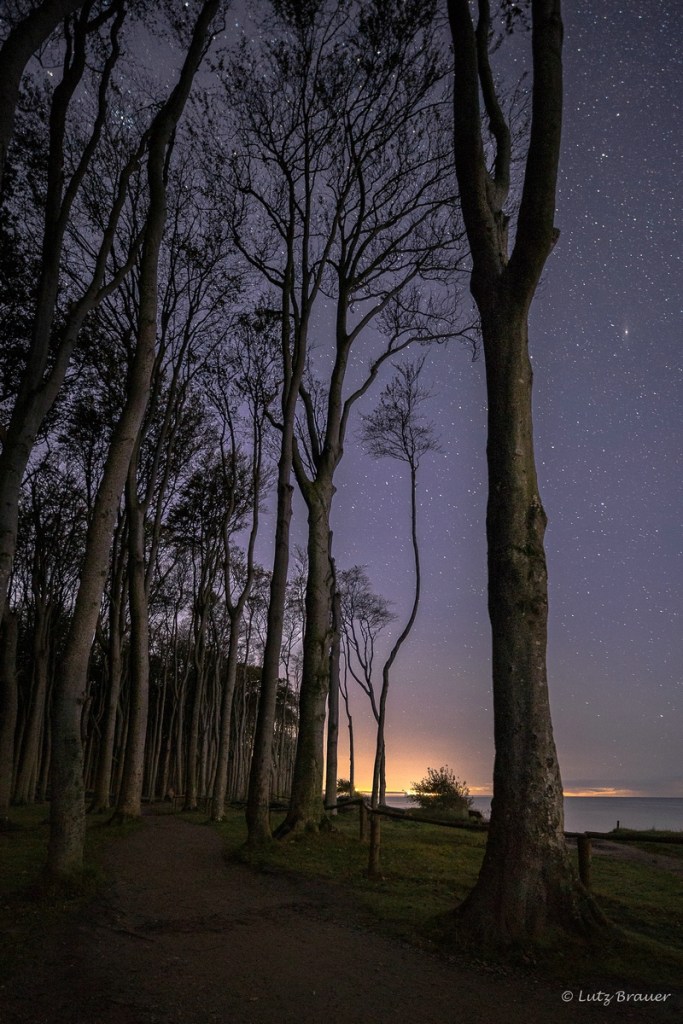 Wir stehen im Gespensterwald. Endlich – das kann man so sagen, denn als Hobbyfotograf war es ein besonderer Anreiz, auch diesen geheimnisvollen Wald an der Ostseeküste zu sehen. Und was ist die beste Zeit dazu? Herbst und Dunkelheit – Nebel und Schneetreiben wären auch nicht schlecht, aber diese Stunde hier zwischen den haushoch gerade aufragenden Baumsäulen in der Finsternis hat es in sich. Nicht dass man sich vor den hier spukenden Geistern und Hexen fürchten würde, aber was da hinten in der undurchdringlichen Schwärze lauert, weiß man auch nicht so klar zu sagen.