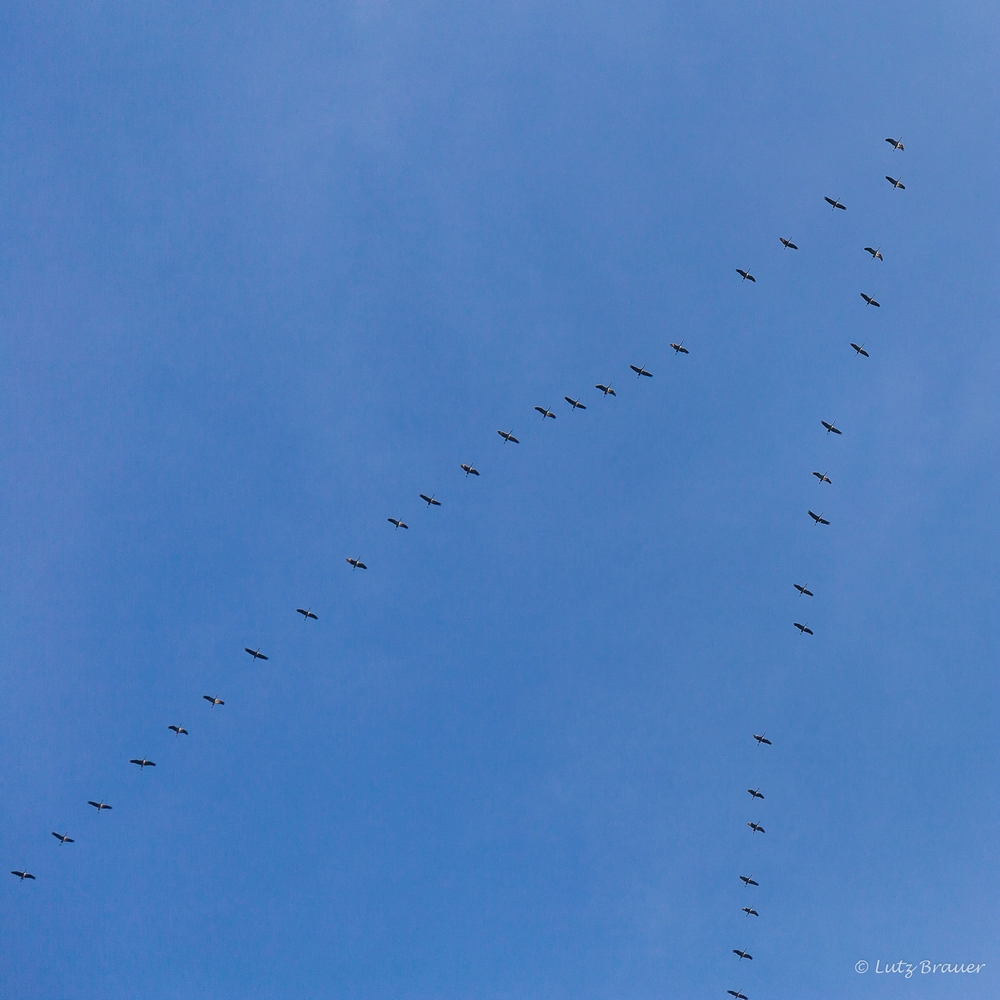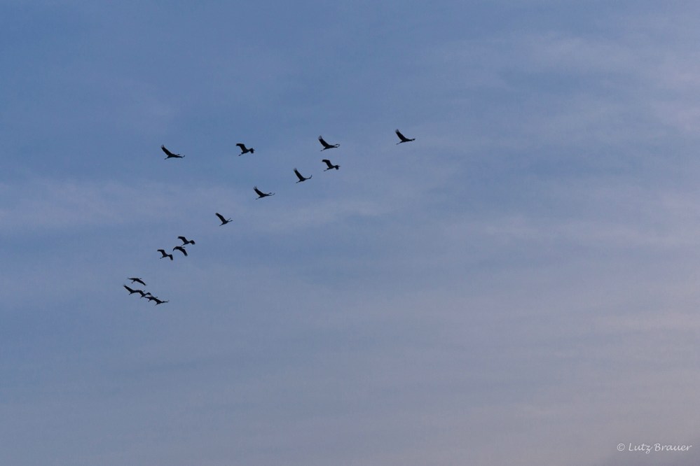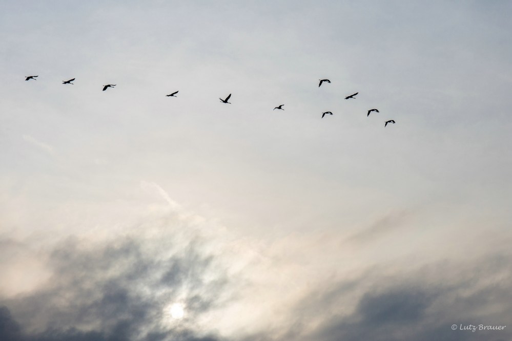 Zum Einen der gespensterhaft aus den Nebelschwaden auftauchende gewaltige Turm des Denkmals auf dem Berg und zum Zweiten die zahlreichen Ketten der Kraniche, die über uns hinweg im Gegenlicht vermutlich zum Kelbra-Stausee fliegen.