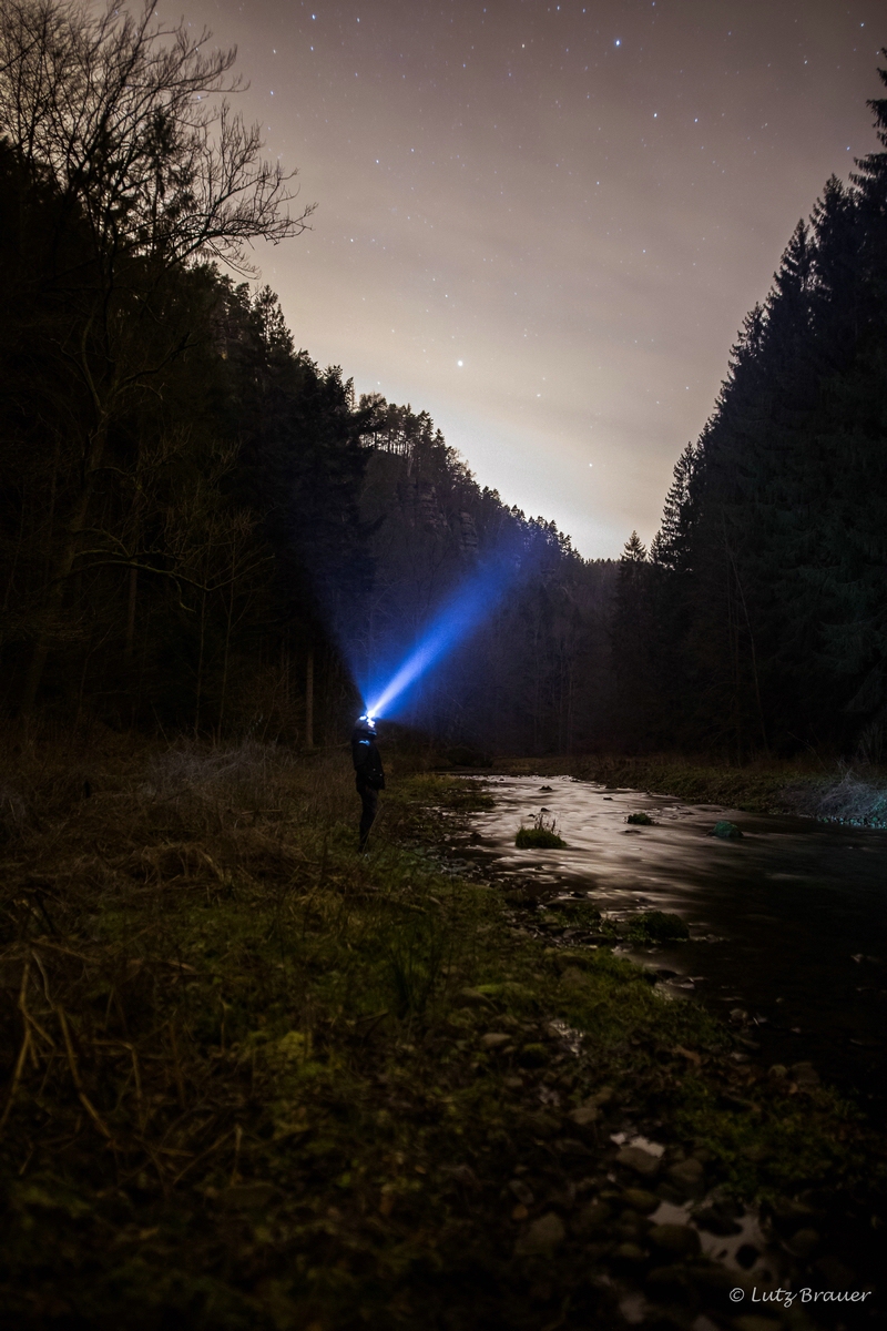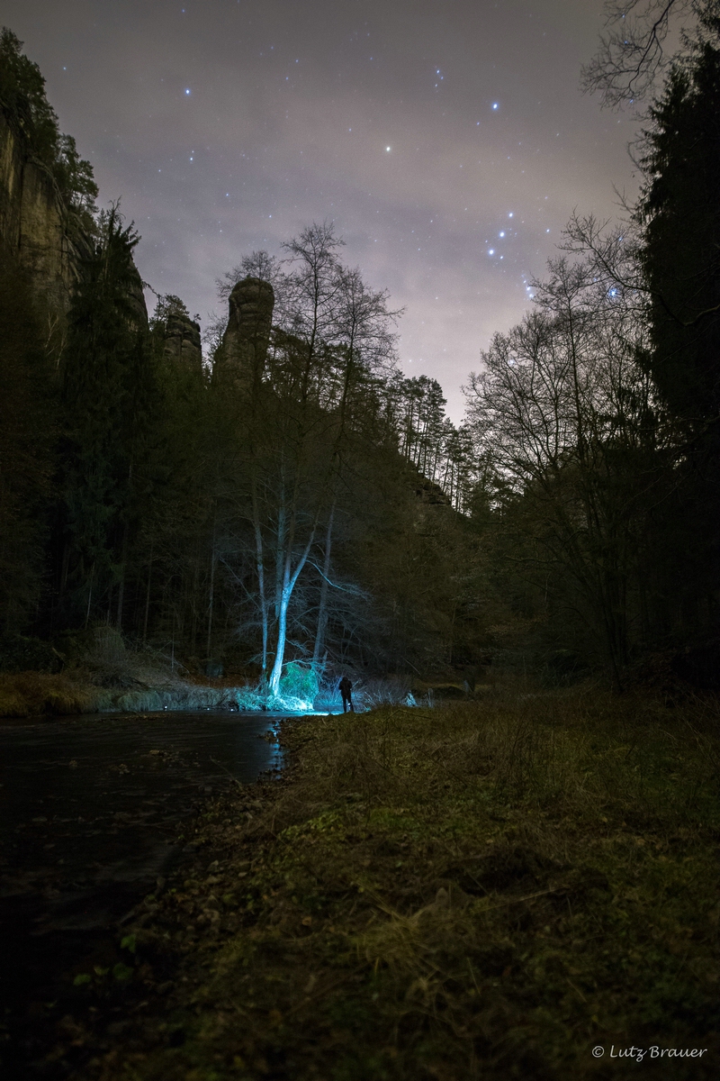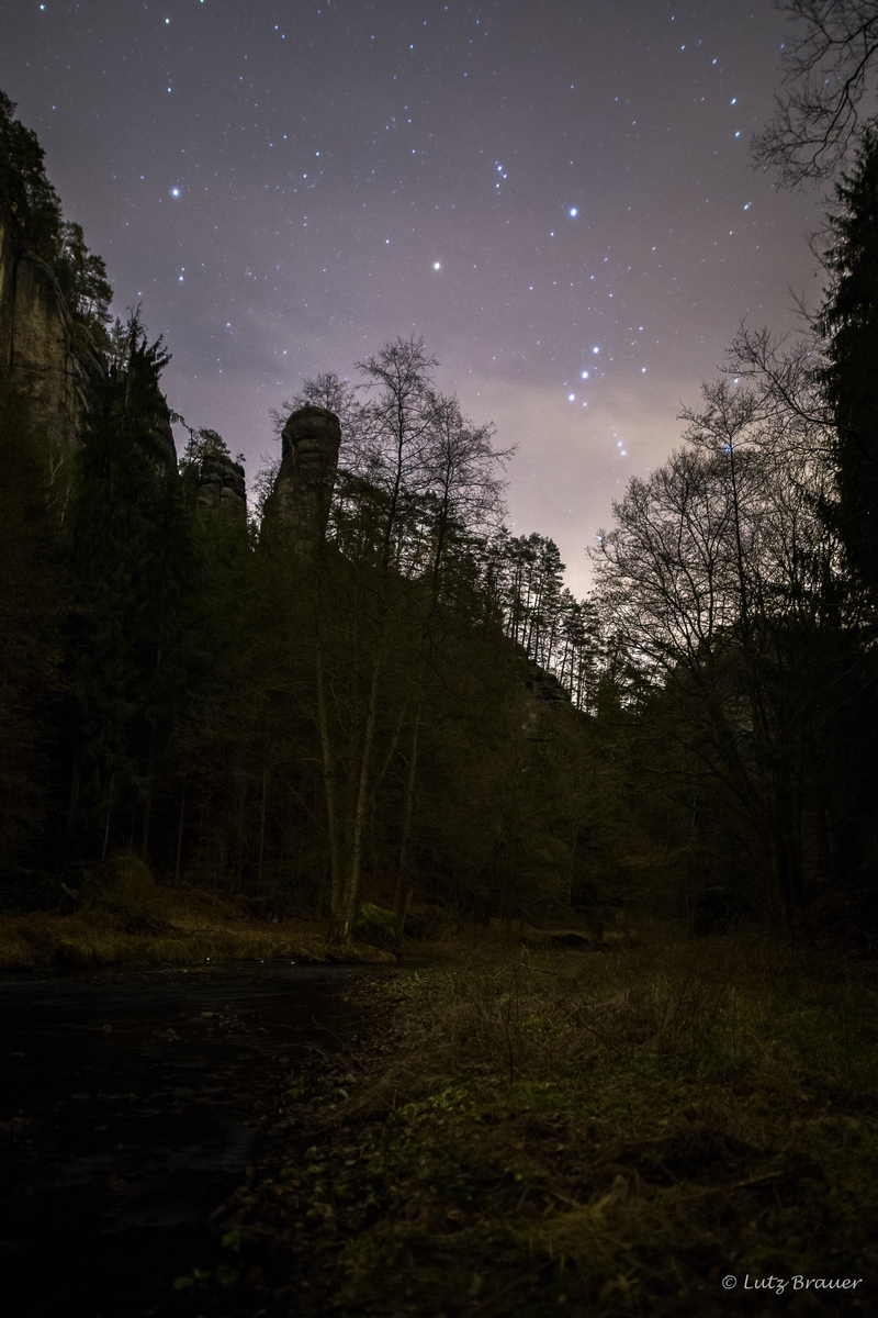 Das wildromantische Polenztal, eingerahmt von schroffen Felswänden, der Felsturm des Polenztalwächters und darüber die Sterne…