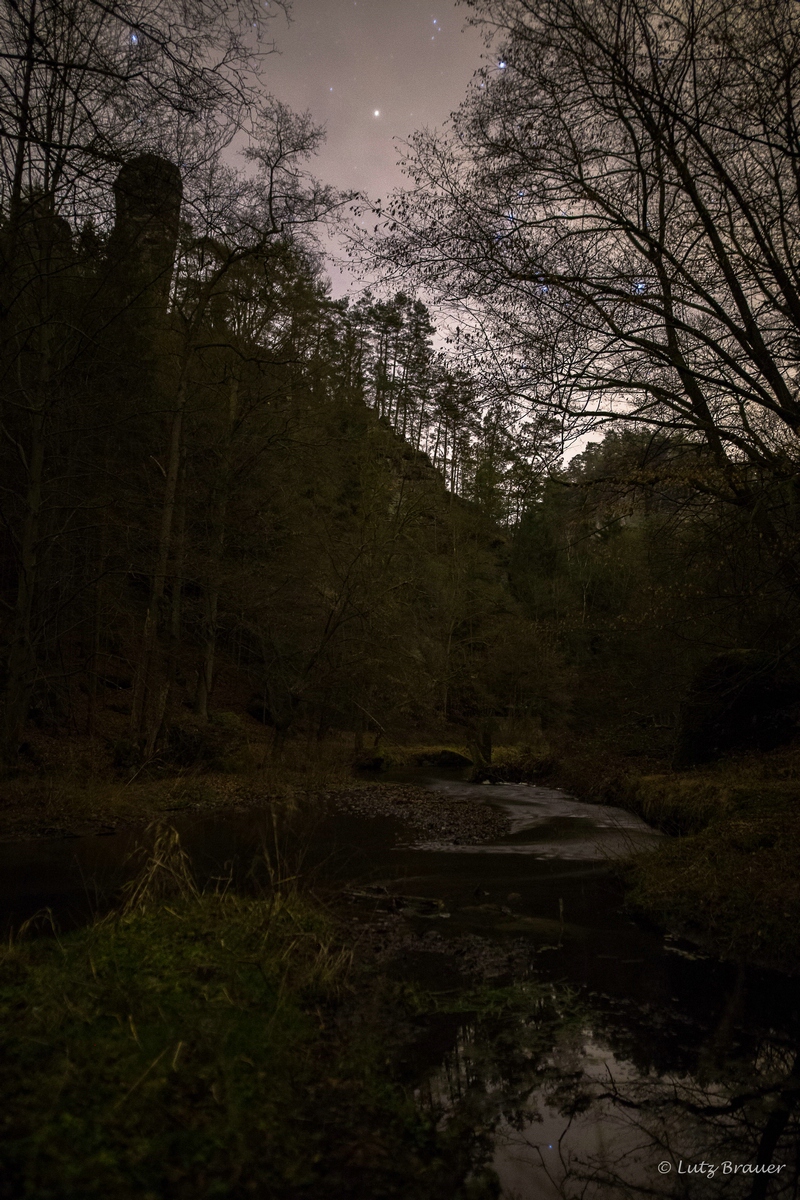 Der Abstieg vom Ziegenrücken ins tiefe Tal dauert nur wenige Minuten, nur F. muss noch eine Solorunde einlegen – er hat die Stirnlampe vergessen, und die ist hier in der Finsternis lebensnotwendig, da einige Wegstellen dicht am steilen Abhang entlang führen. Unten auf dem Talboden am rauschenden (unsichtbaren) Bach ist es stockduster. Zu Zweit ist das Ganze etwas einfacher, gut so, denn falls jetzt doch ein größeres Tier plötzlich erscheinen sollte… Nun ja. Der Kollege vom Reformationsmorgen-Ausflug meinte ja, die Wildschweine wären clever und würden sich kaum Ärger mit zwei Typen wie uns einhandeln. Aber wer weiß.