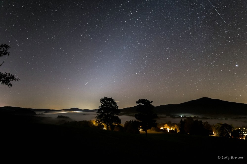 Bei der Durchsicht von Fotos aus dem September 2019 fielen mir einige Bilder mit einer merkwürdigen Leuchterscheinung auf. Obwohl es in der Böhmischen Schweiz noch finstere Nacht war, ließ sich (abgesehen von der Lichtverschmutzung durch die umliegenden Städte und Dörfer) am Südosthorizont einige Zeit vor der Morgendämmerung eine merkwürdige Leuchterscheinung zu beobachten.
