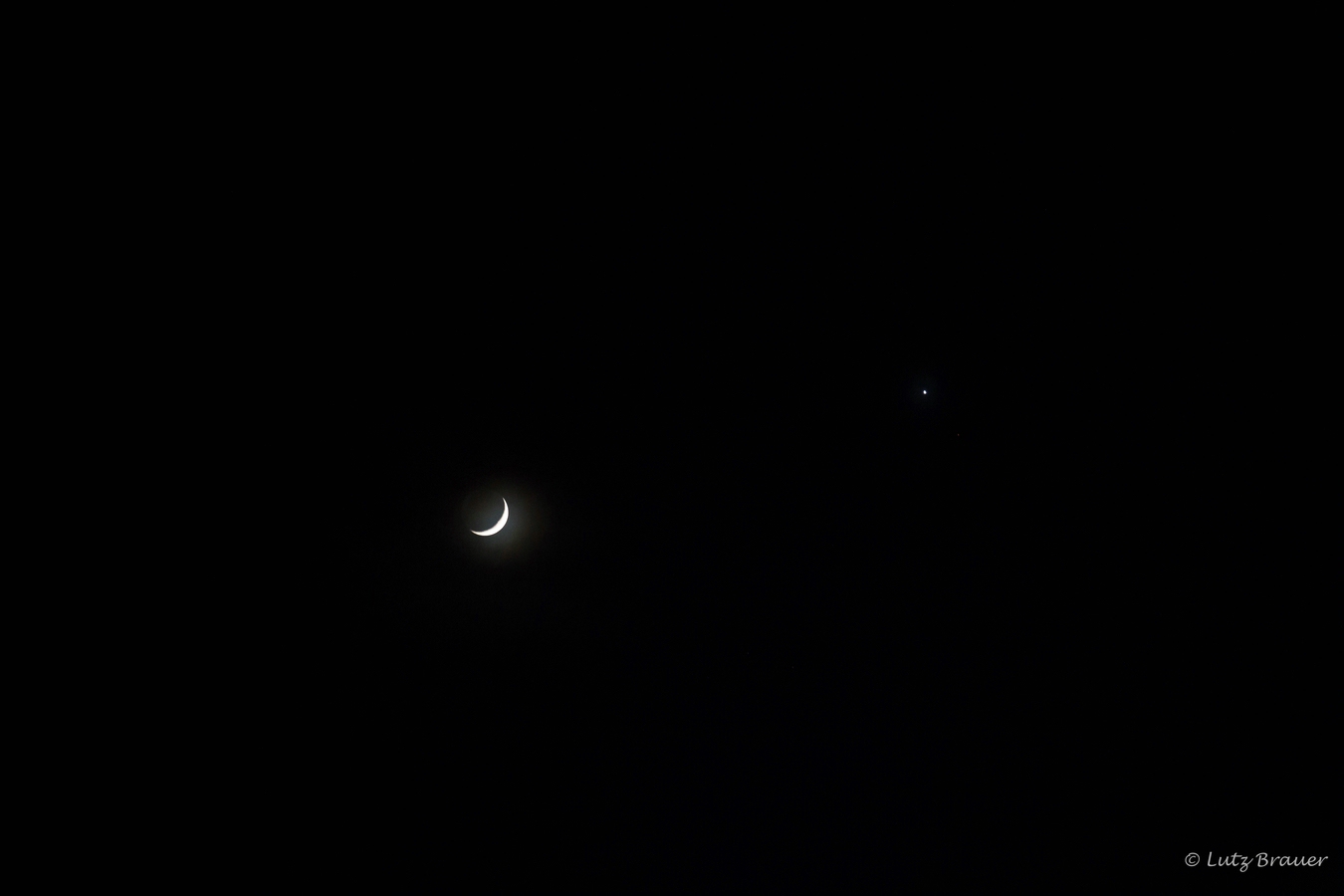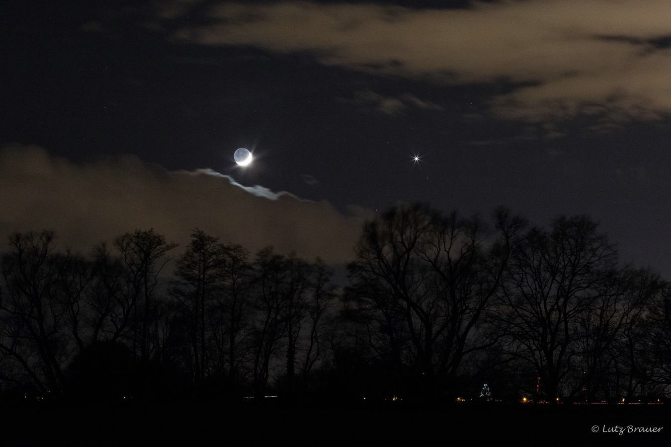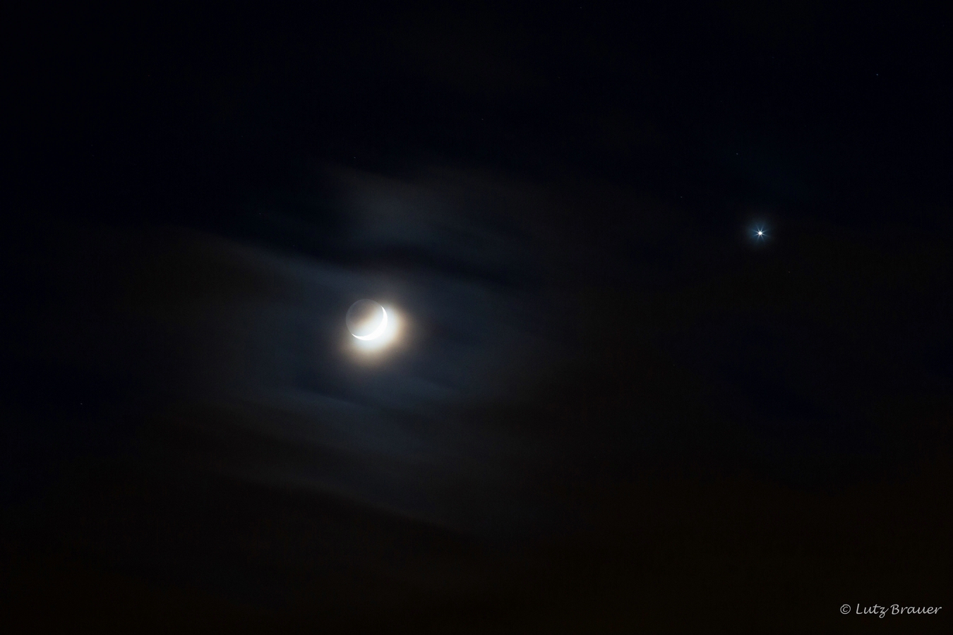 Schon auf dem Heimweg ist am stürmisch bewölkten Abendhimmel das Schauspiel zu beobachten. Die Venus, die zur Zeit besonders hell erstrahlt, befindet sich in unmittelbarer Nachbarschaft zum noch „jungen“ Mond – und das sieht richtig schön aus.