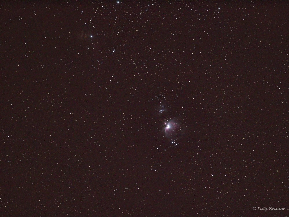 Nun ja, mit etwas Glück (wolkenloser Himmel) und Geduld ist es möglich, quasi schon mit den vorhandenen Hausmitteln (also hier einem 200 mm Objektiv, welches allerdings (wegen nicht vorhandener Nachführung) nur kurze Belichtungszeiten zulässt) und ein wenig Nachbearbeitung, also dem Stacken von zig Einzelaufnahmen (dazu gibt es z.B. Sequator als Freeware), einen Sternennebel abzulichten. Dieser Nebel befindet sich unterhalb der Gürtelsterne des Orions im Schwert, nennt sich M42, Orionnebel und ist sogar als diffuses Sternchen mit bloßem Auge sichtbar.