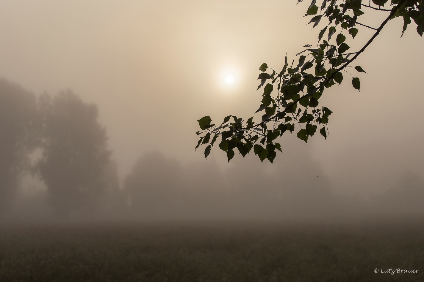 Eine düstere, melancholische Stimmung macht sich da breit… Und trotzdem, diese holzschnittartigen Umrisse der Bäume und Blätter vor dem grellen Sonnenlicht, welches mühsam durch die dichten Schwaden drängt. Das hat etwas…