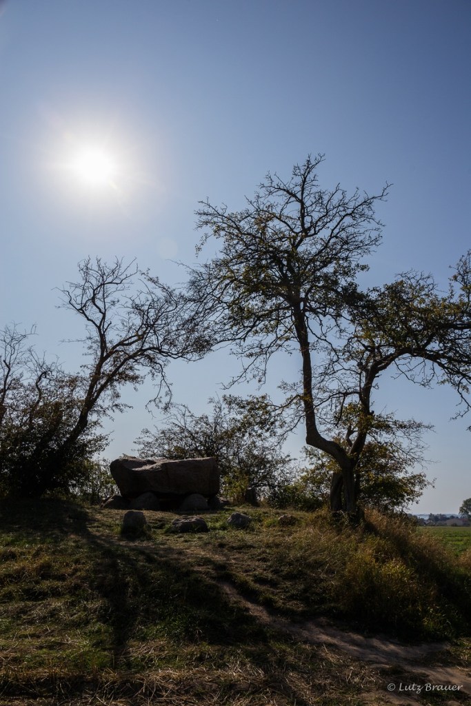 Letztendlich fiel dann die Wahl auf ein für das Bildvorhaben ideal geeignetes Großsteingrab südöstlich unseres Dörfchens. Auf einer leichten Anhöhe stehend, von alten knorrigen Bäumen gesäumt, mit freiem Blick auf die Meeresbucht und nach Südwesten. Das passte hervorragend.
