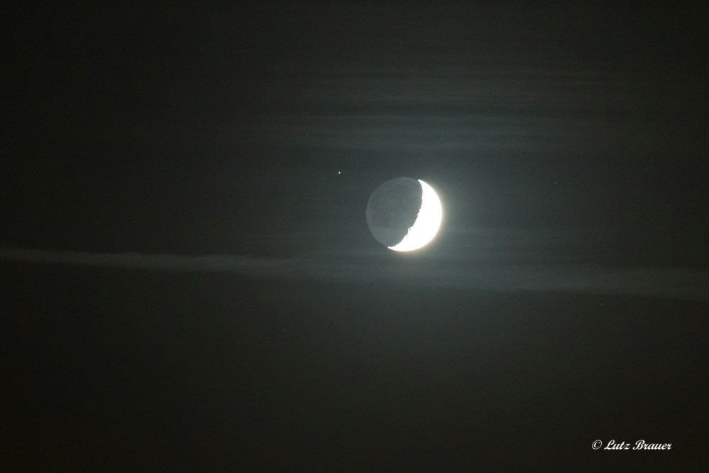 Kurz vor der Tagesschau geht der Blick noch einmal aus dem Fenster. Uiiiii – das gibts doch gar nicht. Wie an einer Perlenkette stehen da draußen von links nach rechts gesehen Saturn, Jupiter und Mond am dunklen Abendhimmel. Nichts wie hinaus, das kommt so schnell nicht wieder, das muss man festhalten.