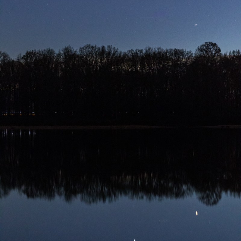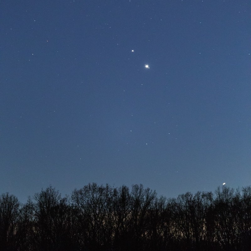 Etwas weiter stehen Jupiter und Saturn ganz dicht beisammen über den Bäumen gegenüber und spiegeln sich im See.