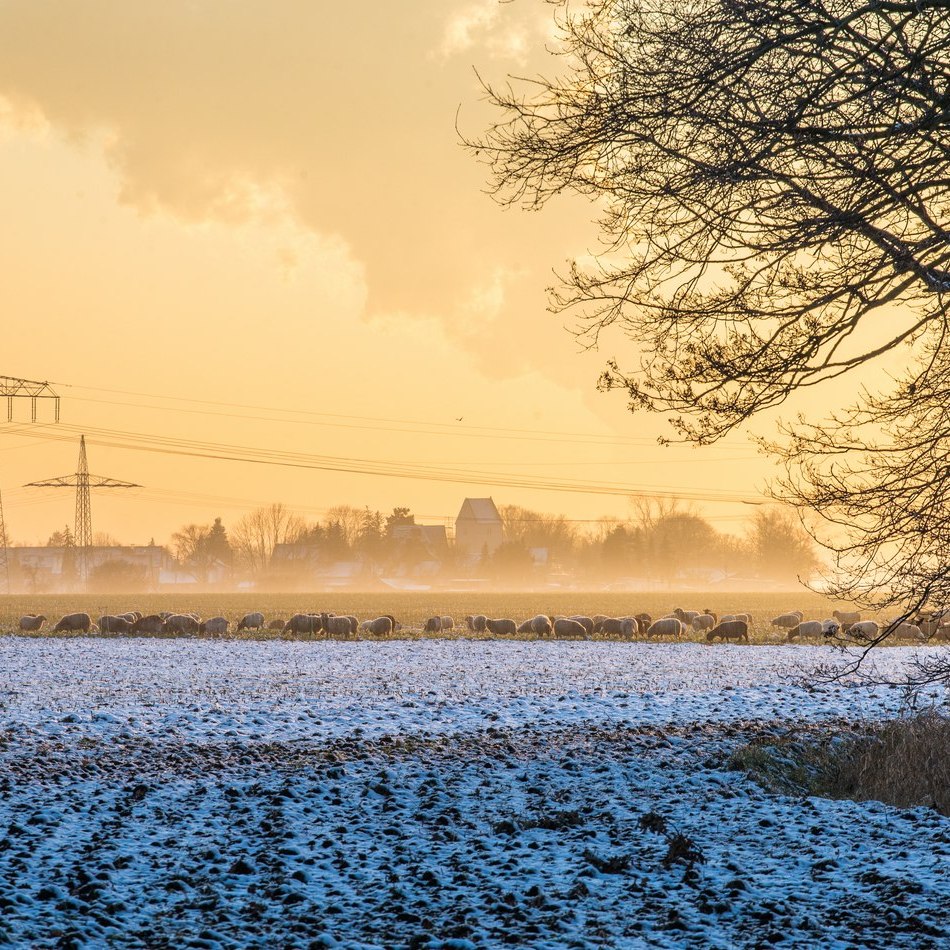 Man nehme etwas Schnee, eine Schafherde, Sonnenuntergangsfarben -nein, die Stromleitungen werden selbstverständlich nicht wegretuschiert, auch nicht die gewaltige Qualmwolke vom Kraftwerk südlich der großen Stadt, das gehört dazu . na und dann noch ein Kirchlein…