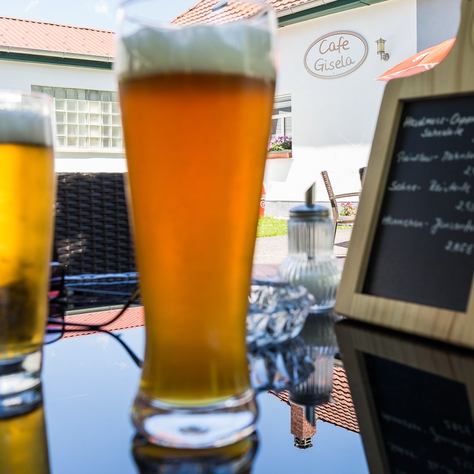 Erst nach ca. 30 Kilometern lädt „Giselas Café“ mit einem schönen schattigen Freisitz zu einer ausgiebigen Pause ein. Zwei Hefeweiße, zwei große Radler, alles ohne Alkohol versteht sich, denn der würde uns gnadenlos vom Rad fegen. Dazu Hannchen-Jensen-Torte, die kennen wir (zum Erstaunen der Chefin) nicht, schmeckt aber seeeehr gut. Genau das Richtige.