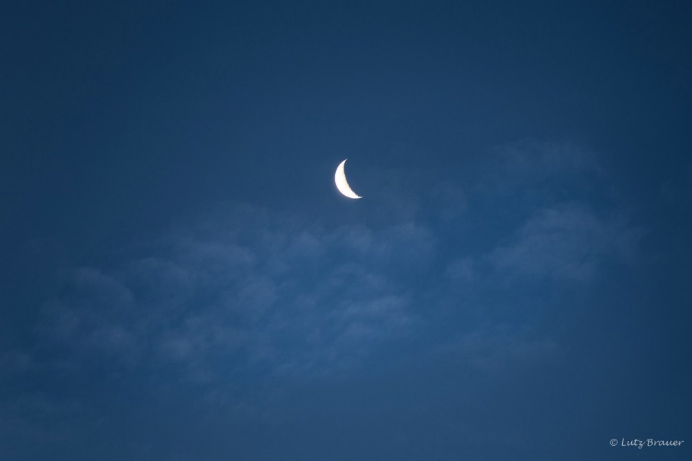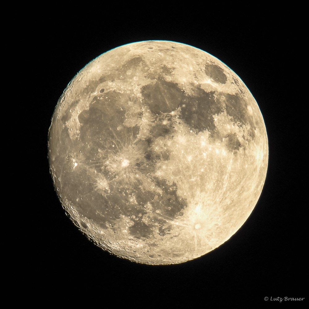 Die Detailaufnahmen entstanden mit einer Brennweite von 600 mm. Belichtungszeit beim Vollmond 1/250 s (abends in der sog. nautischen Dämmerung), beim abnehmenden Mond 1/30 s (morgens in der Blauen Stunde), alles generell mit Stativ. Um eine größere Schärfe der Bilder zu erreichen, wurden jeweils Bildserien von ca. 10 Fotos mit Sequator gestackt und anschließend im Lightroom noch Kontrast, Lichter und Tiefen etwas „nachgezogen“.