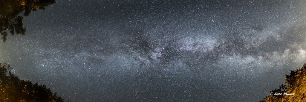 (das man hier so viel Sterne sehen kann, liegt nicht unbedingt am Wein, sondern an der wirklich sehr tiefen Finsternis – nur so war es auch möglich, endlich einmal ein Panorama der Milchstraße aufzunehmen. – Anklicken und Vergrößern lohnt sich – in der Bildmitte kann man sogar beim genauen Hinschauen den rötlichen Nordamerikanebel und den Stern Deneb erkennen)