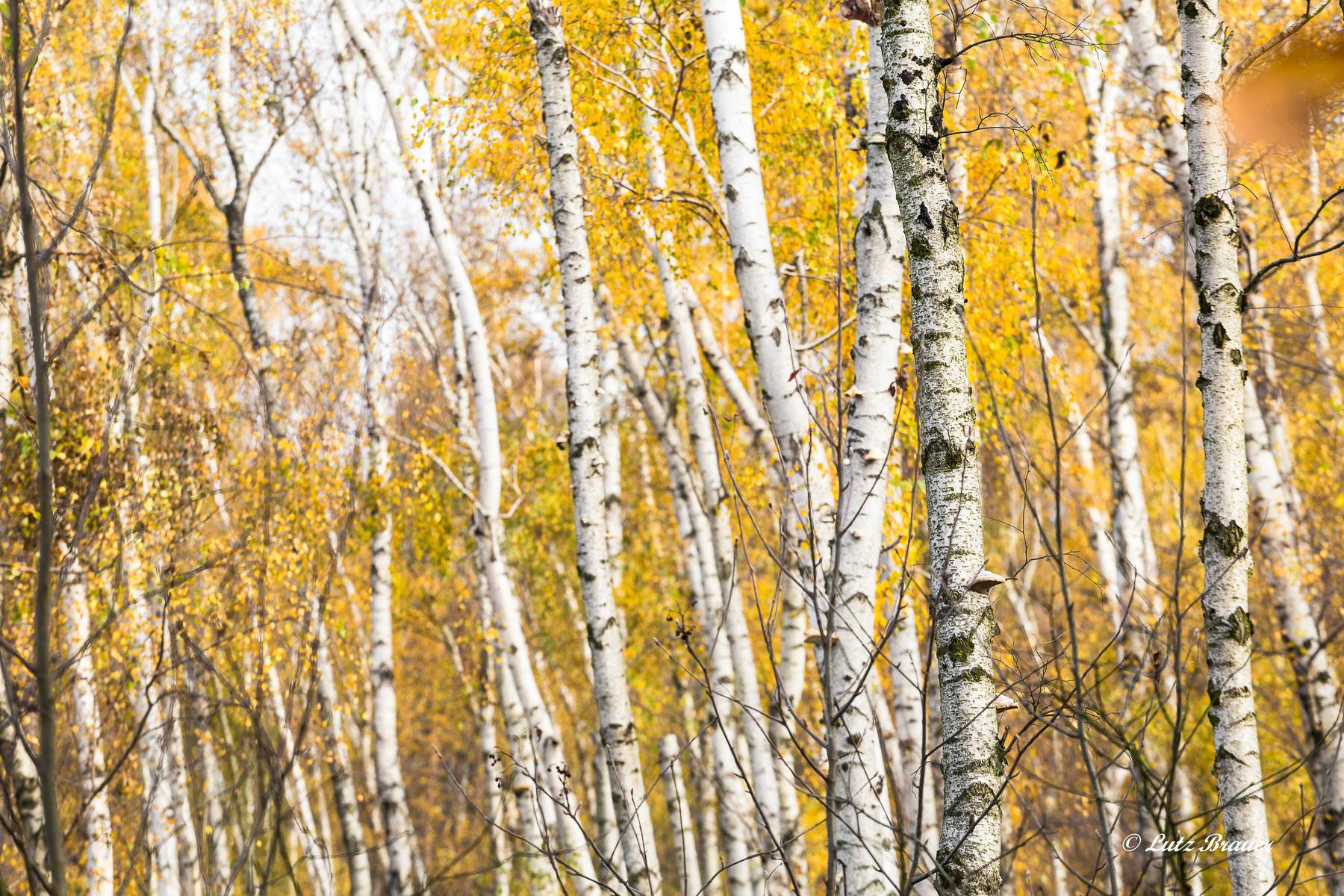 Nachdem wir uns einige Zeit durch den vom Sturm arg in Mitleidenschaft gezogenen Wald mit seinen gebrochenen und umgestürzten Bäumen gemüht haben, öffnet sich der Blick noch einmal und gibt einen vom milden Herbstsonnenlicht durchfluteten Birkenhain frei. Zeit zum Schwelgen in üppigen Farben und Lichtern…