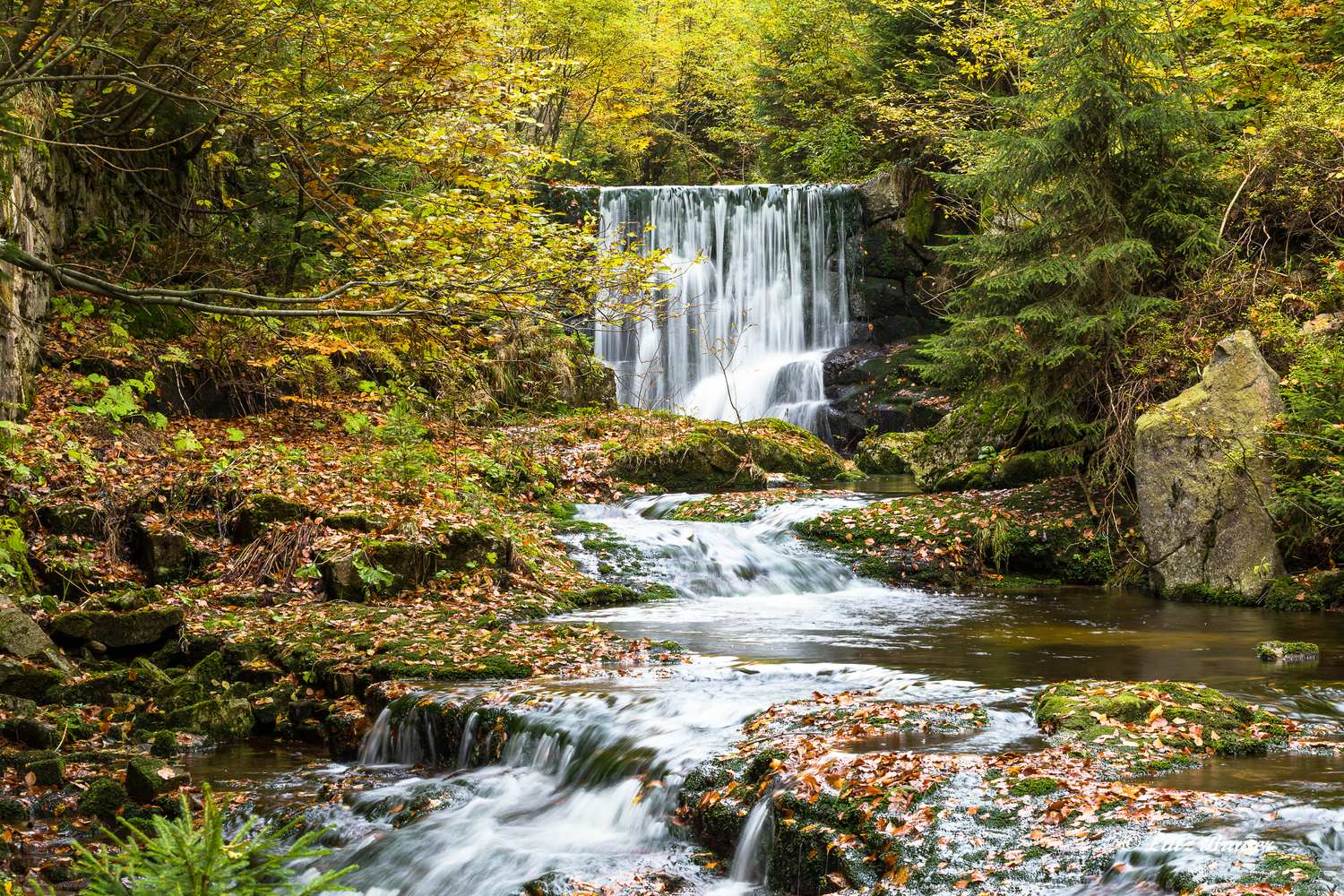 Tief im hinteren Gebirge befindet sich das Tal der Weißen Elbe. In zahllosen Kaskaden und schon vor langer Zeit entstandenen künstlichen Wasserfällen schäumt das Wasser dort bergab. Nur wenige Menschen, der Fußweg bis zur nächsten Baude ist recht weit, verirren sich in dieses abgeschiedene Tal.
