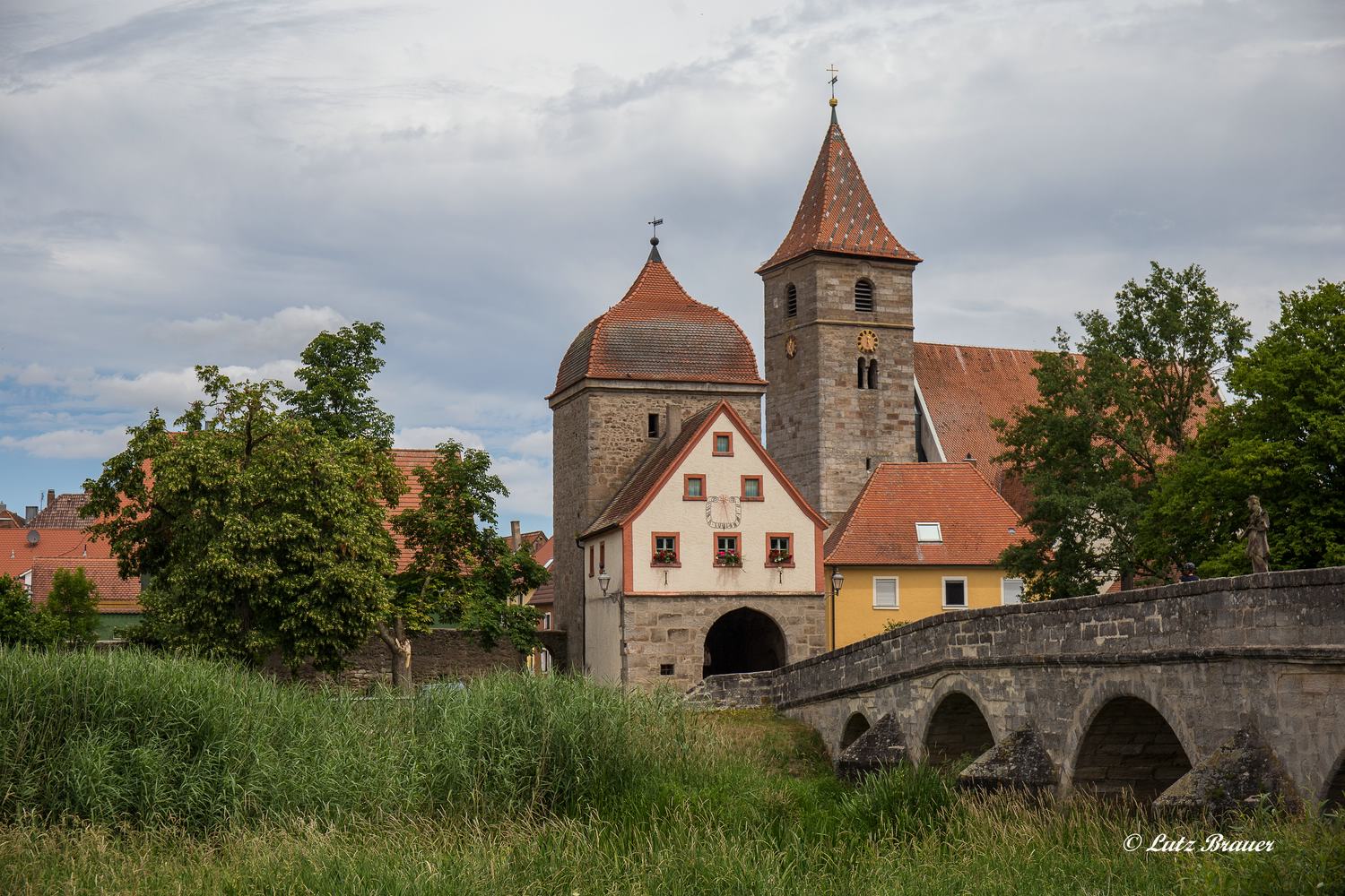 6.45 Uhr Aufstehen, wir packen rasch, stellen die Taschen an der Rezeption ab und lassen uns das gute Frühstück schmecken. Gegen 10 Uhr ist Abfahrt, auf Schleichwegen südlich aus Ansbach hinaus, befinden wir uns bald in einem schönen Bachtal, sind dort nicht ganz die Einzigen, aber die E-Radler sind schnell unseren Blicken entschwunden. Stellenweise führt der Schotterweg steil hinauf nach Elpersdorf, ehe wir es danach lange nach Herrieden hinab rollen lassen können. Dort halten wir uns allerdings nicht lange auf, machen ein paar Fotos an der schönen Altmühlbrücke mit Storchentor und kurbeln dann zügig in Richtung Gunzenhausen Altmühl-abwärts