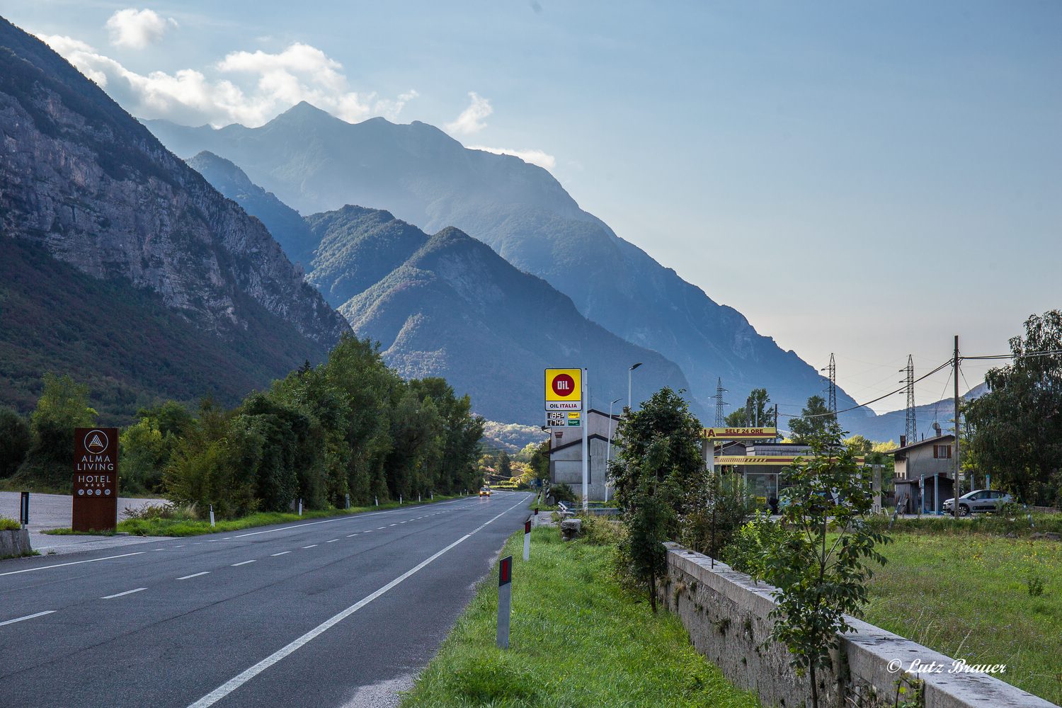 Um die Bergspitzen ziehen Wolken, das sind schöne Lichteffekte in der Morgensonne. Und ein paar Fotos vom Ende der Welt müssen noch sein, ehe wir auf dem Randstreifen der Nationalstraße nach dem nahen Venzone radeln.