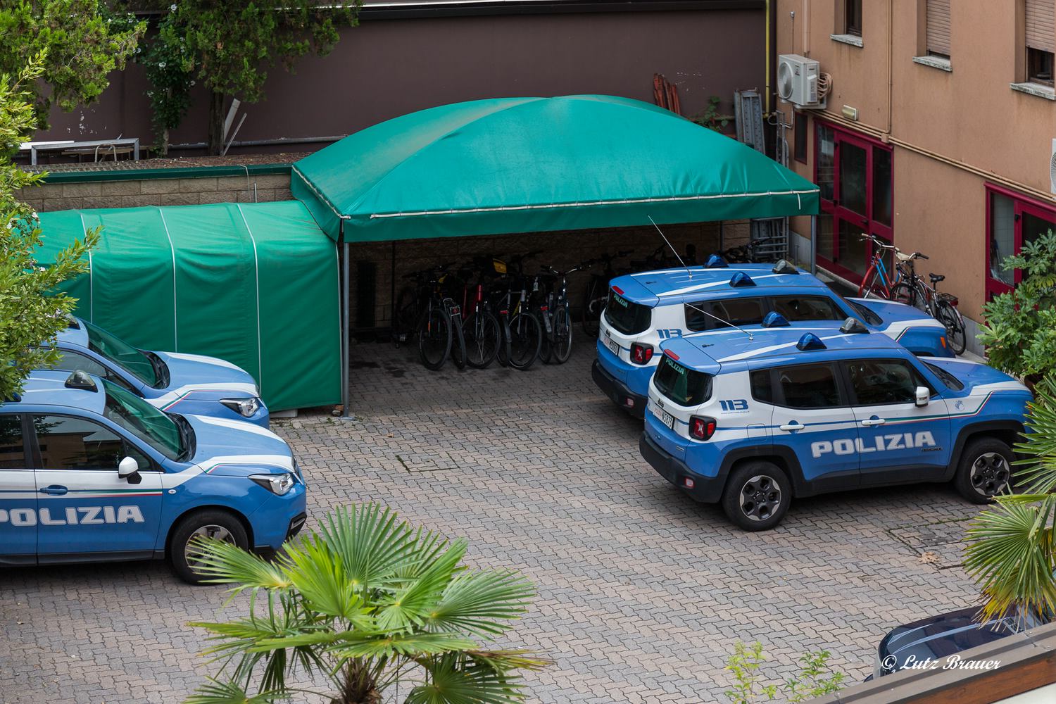 Etwas benebelt vom Lärm und Durcheinander erreichen wir auch das Hotel – von der Hinterseite her. Der Anblick ist nicht sehr vertrauenerweckend, das Ganze wirkt etwas abgewrackt und als wir die Räder im Hof unterstellen, irritieren auch die hier parkenden Polizeiautos etwas. So sicher waren wir während der ganzen Tour nicht untergebracht. Innen wirkt das Hotel San Giorgio durchaus seriös und das supermoderne Zimmer mit supermodernem Bad überraschen dann.