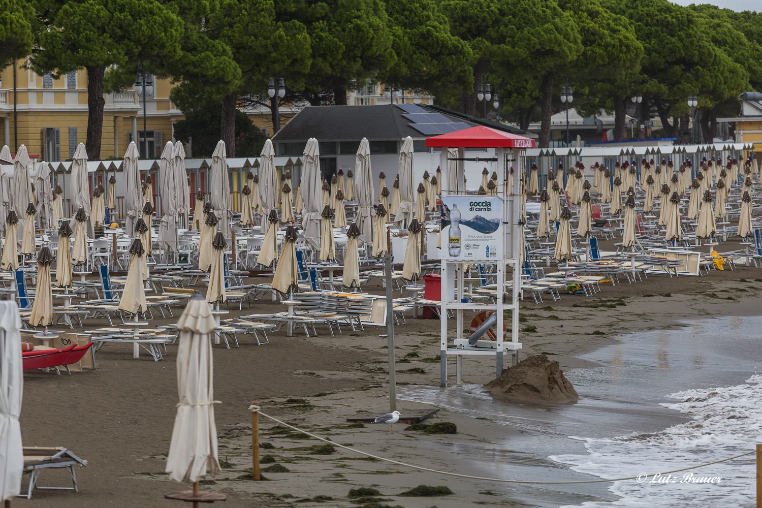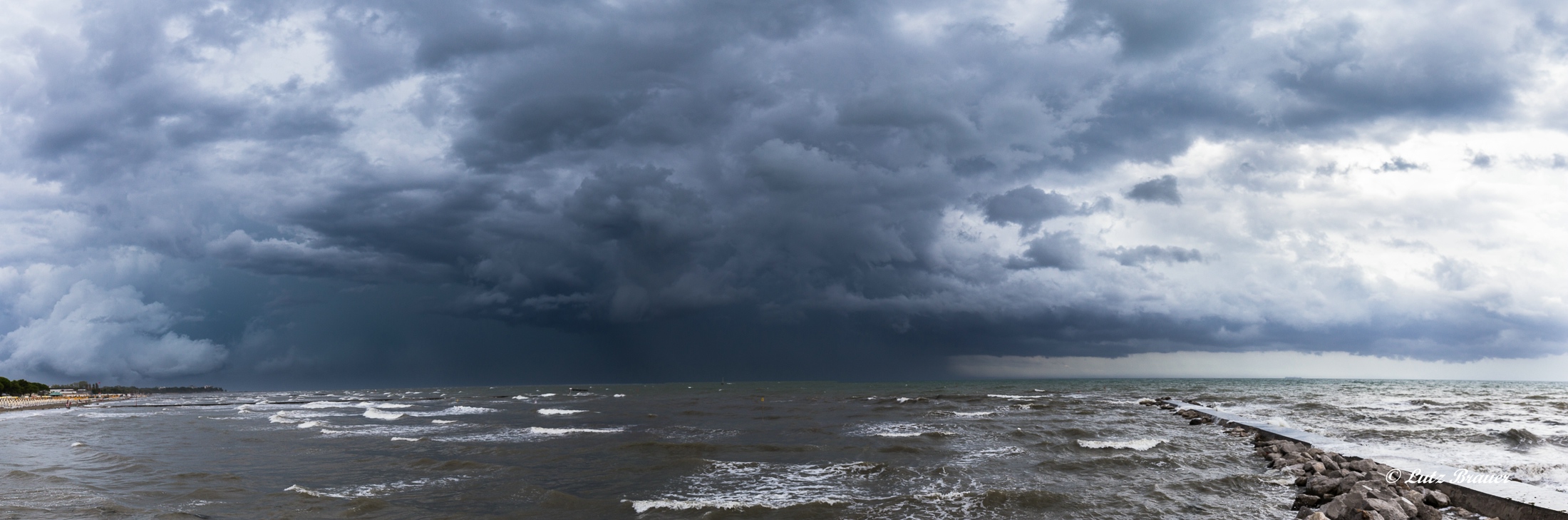 Der Regenradar sagt nein. Zwar ziehen nördlich, jetzt möchten wir nicht auf dem Rad in den Alpen stecken, und südlich Gewitter vorbei in Richtung Slowenien jenseits der Bucht, aber bei uns ist es bald wieder vorbei, was ich kurz entschlossen dazu nutze, die abziehenden Gewitterwolken über dem Meer abzulichten. Sehr eindrucksvoll…