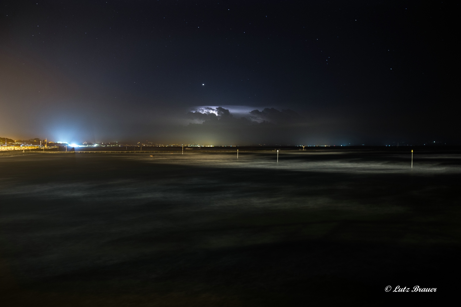 Die Kamera sieht mehr als das Auge. Es herrscht fast völlige Finsternis, die nur von den Lichtern an den Küsten durchdrungen wird. Laut rauscht die Brandung, weiß sind die Schaumkämme der Wellen zu erahnen, dann erhellt plötzlich ein Blitz des nächtlichen Gewitters über Triest und den Julischen Alpen einen gespenstisch wirkenden Wolkenhorizont.