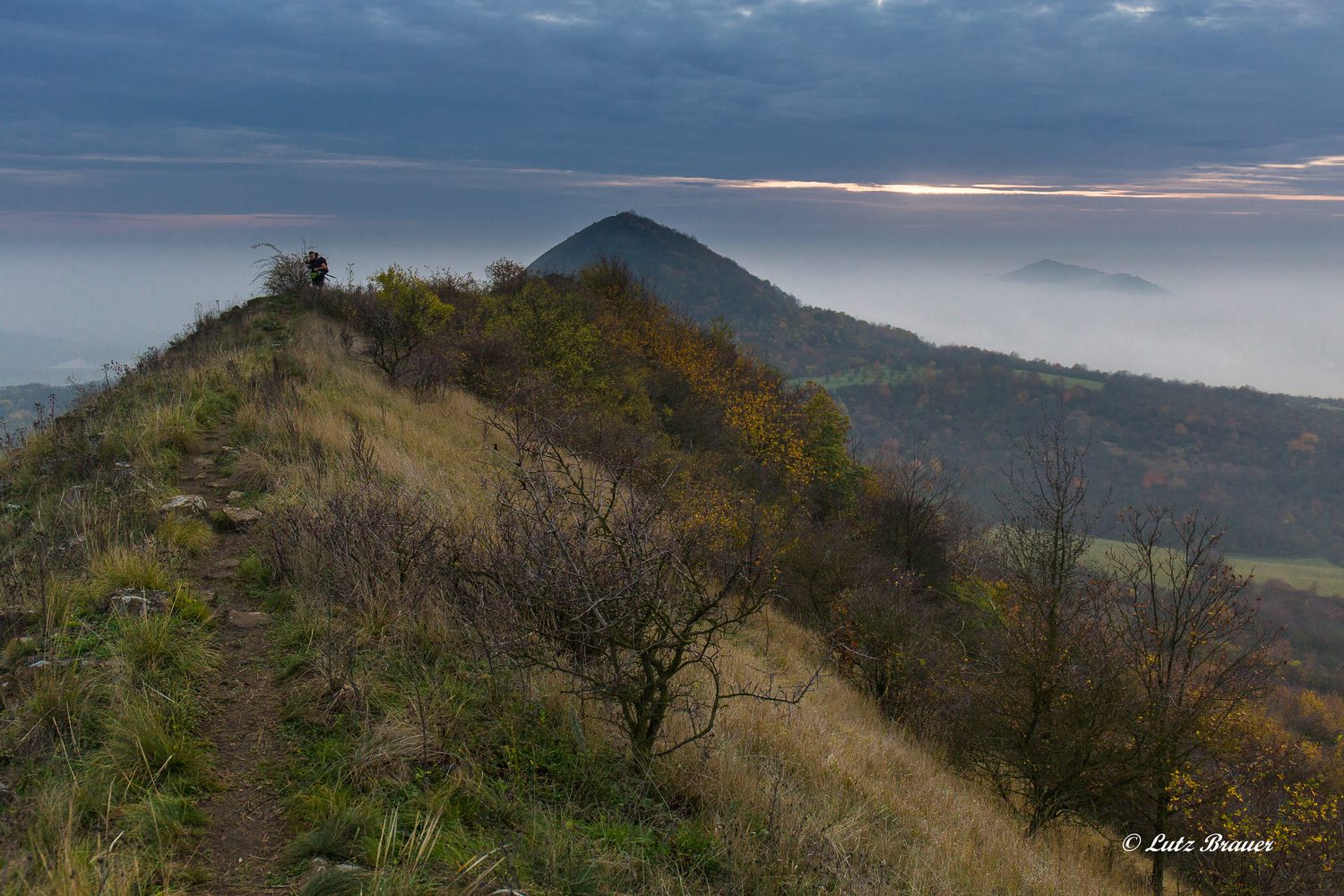 Aus dem abendlichen Nebeldunst ragen die Gipfelkuppen der umliegenden Berge, die ebenfalls vulkanischen Ursprungs sind. Rana, auf dem wollen wir morgen, ganz in der Frühe, den Sonnenaufgang begrüßen, drüben die Mila, direkt gegenüber der Oblik, hinter uns Brnik und dann, wie an einer Perlenschnur die Kette der kleineren Hügel und die Berge von Milesovka bis Kletecna…