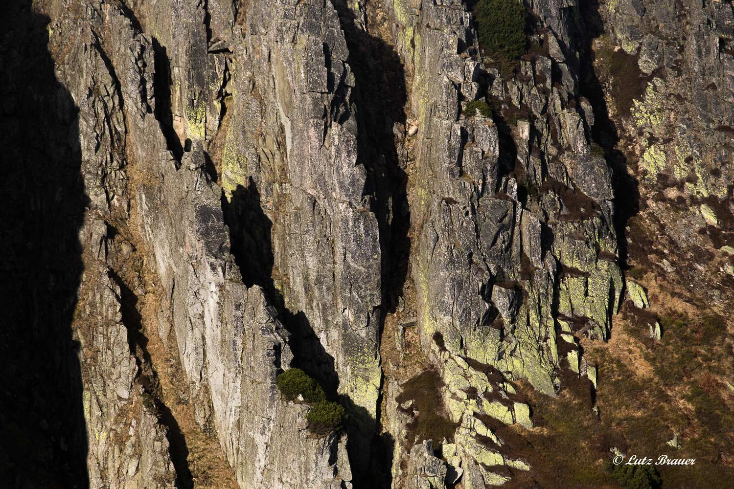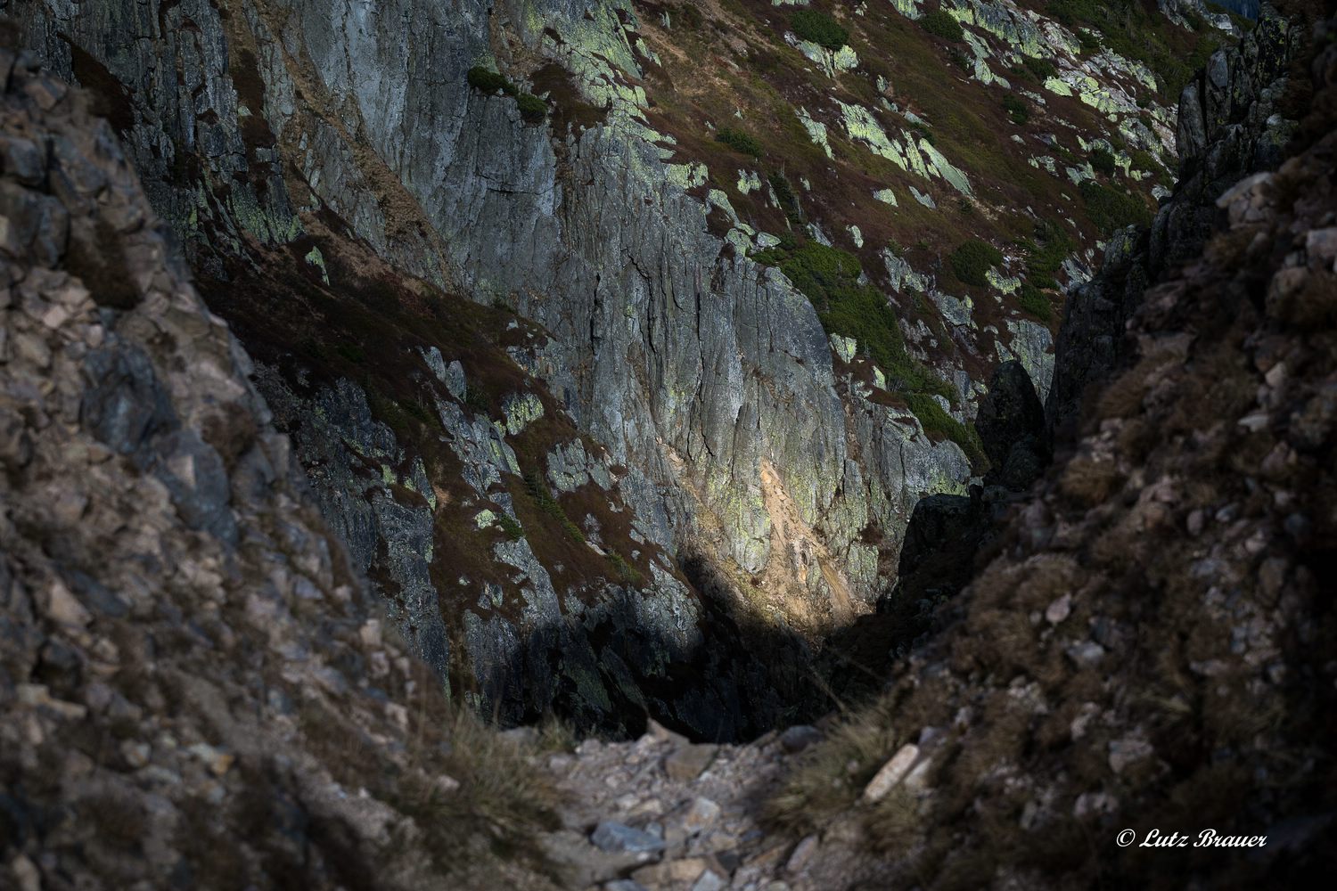 Im Wechsel von Wolkennebel und Sonnenlichtern steigen wir also zum Vysoke Kolo auf, umrunden ihn auf dem nördlichen Hang und blicken im eisig-kalten Wind (wann gab es überhaupt schon einmal windstille Momente hier oben – kann mich nicht erinnern) endlich hinab in die finsteren Schneegruben, in die nur selten ein Lichtstrahl fällt.