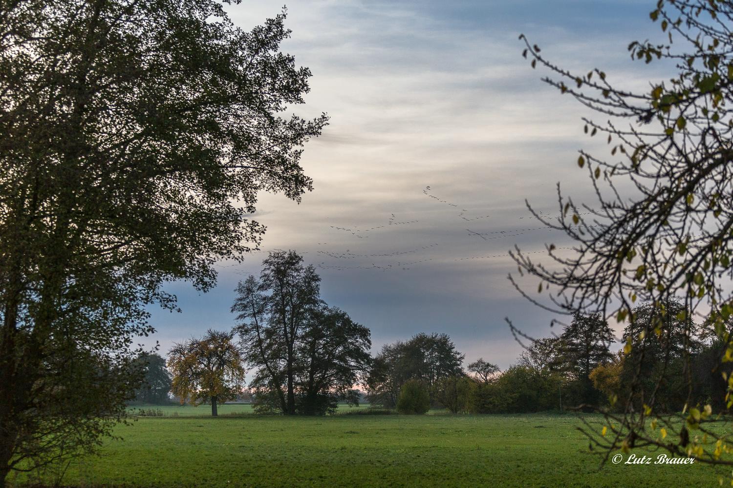 Und so feiern wir wieder einmal die Momente,an denen die langen Kranich-Ketten abends über uns hinweg zu den Schlafplätzen ziehen.