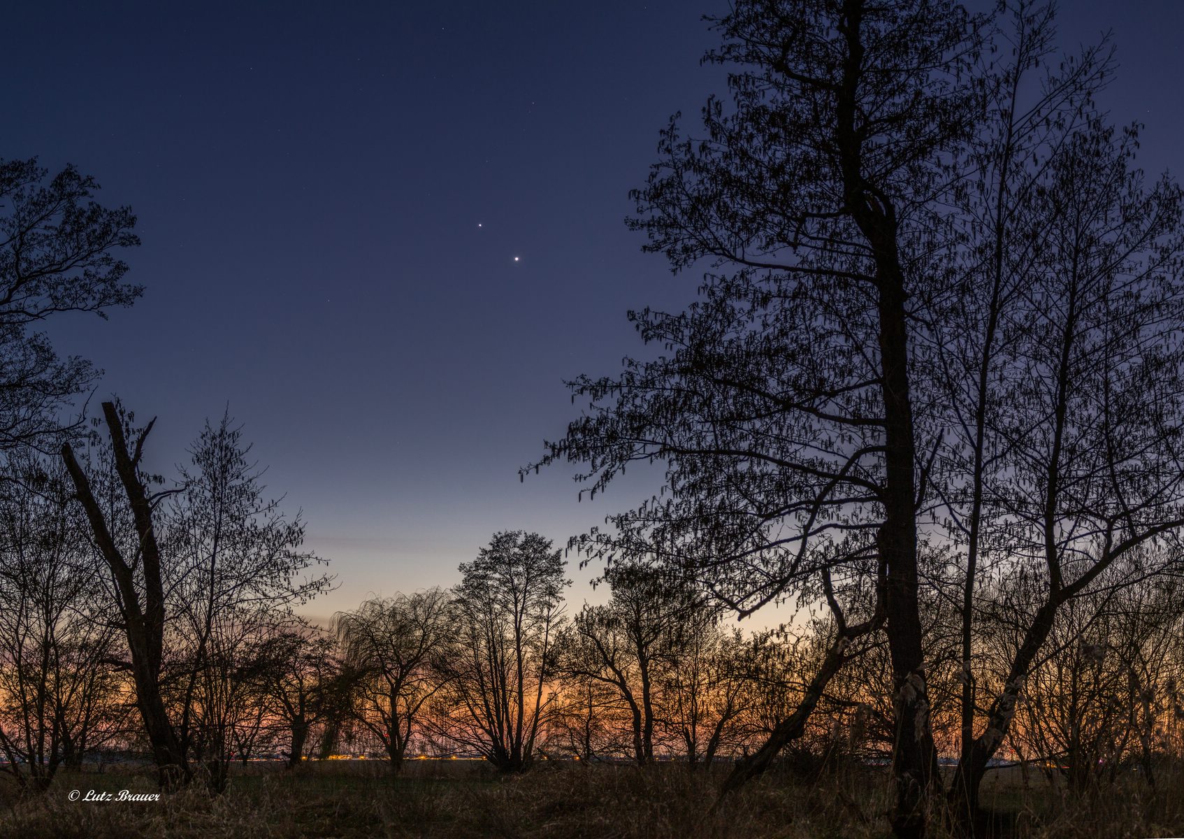 Es dauert nicht lange, bis die Dämmerung nach Sonnenuntergang so in Dunkelheit übergeht, dass die beiden Planeten in der heutigen Konstellation gut zu sehen sind.