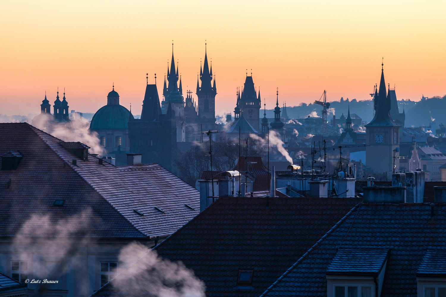 Kalt ist es, die Wiesen schneebedeckt. Aber die Spannung auf das erhoffte optische und fotografische Erlebnis lassen keine fröstelnden Gefühle aufkommen. Erste Morgenlichter präsentieren zunehmend die Turmkulisse der alten Stadt in ganz neuen Bildern. Das ist das Goldene Prag, so stellt man sich das vor.