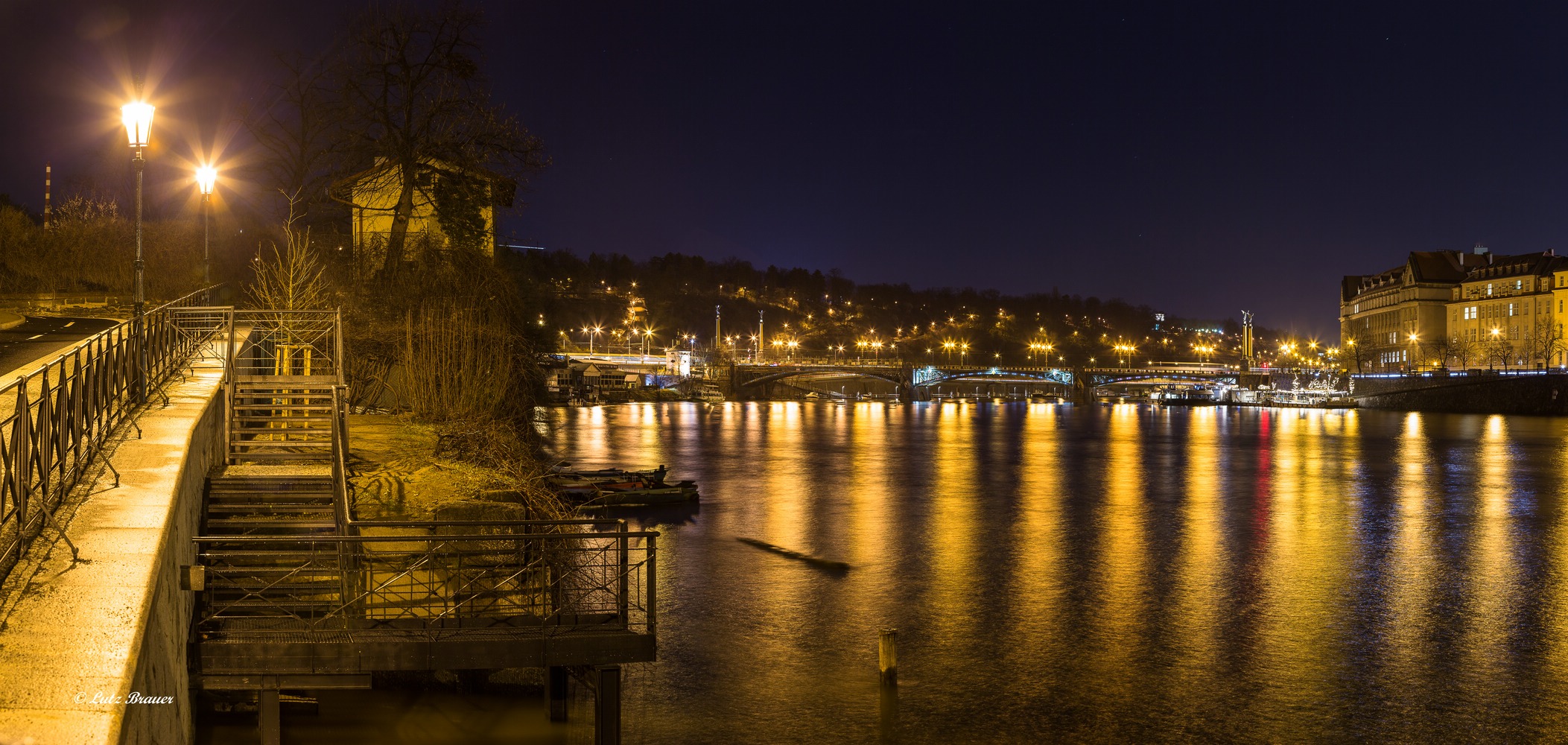 Auf den Letna-Terrassen bieten sich besonders bei Nacht fantastische Ausblicke auf die Brücken über den Fluss und die Lichter der Stadt. Und nicht zuletzt auf den Streifzügen am ruhigen Fluss, den dahin gleitenden beleuchteten Ausflugsbooten, dem modrigen Geruch des Uferschlamms und der mutigen Maus, die sich unbeirrt von uns in der Dunkelheit ihre Nahrung sucht, bekommt man das Gefühl, in dieser Stadt angekommen zu sein.