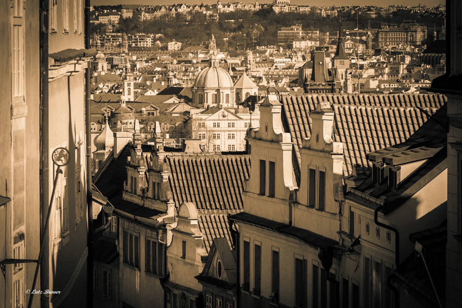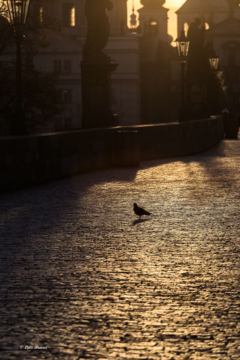 Und dann ist da andererseits in den ganz frühen Morgenstunden das Licht des Tagesanbruchs über den Türmen der uralten Goldenen Stadt, die menschenleere Karlsbrücke mit den Laternen und den Heiligen, die stillen Gassen und Kolonnaden von Mala Strana, der Kleinseite, in denen man jederzeit darauf gefasst sein darf, möglicherweise Kafka auf seinem Weg in die Versicherungsgesellschaft, Meyrink, Hasek, Smetana (?) zu begegnen…