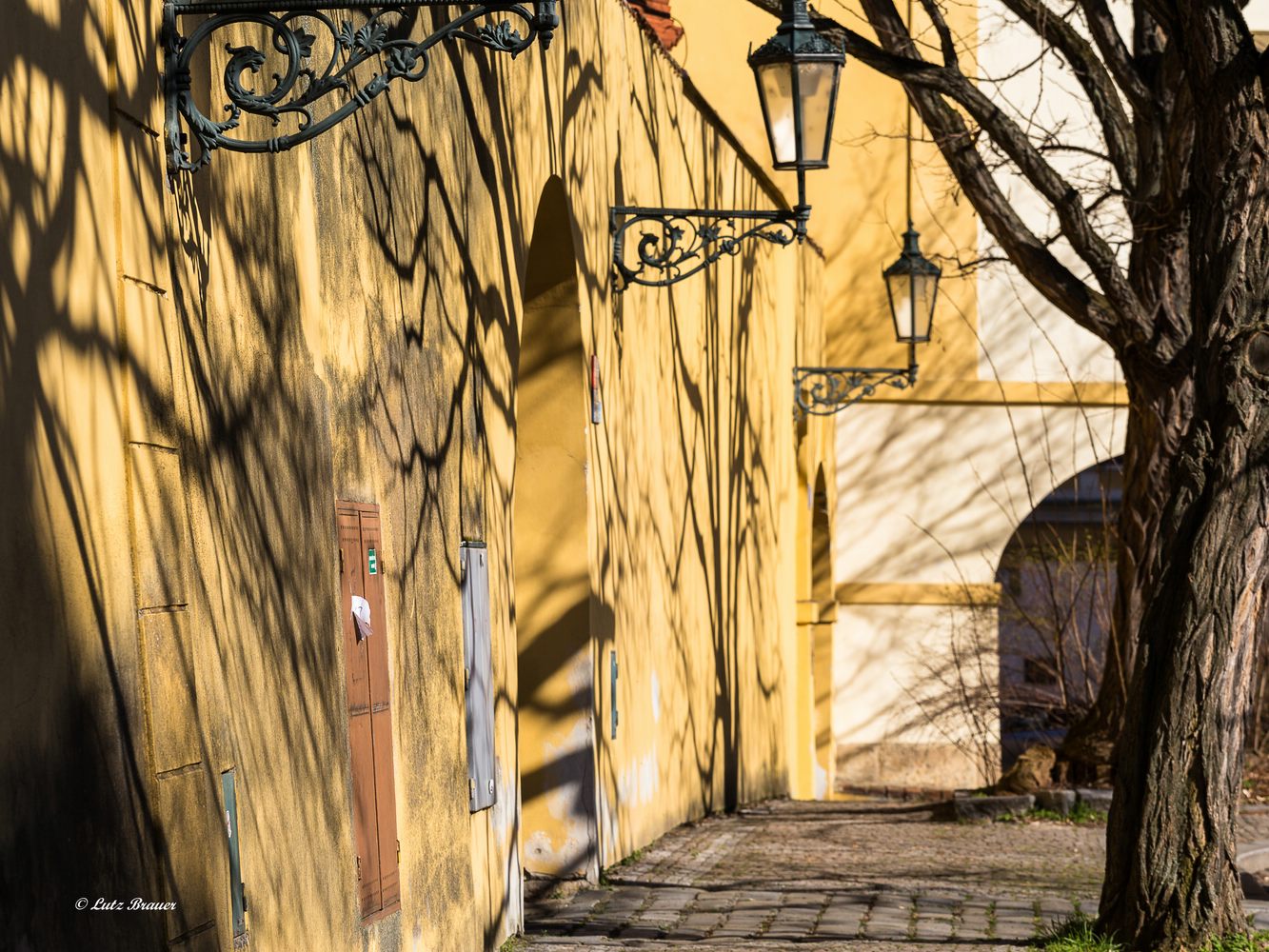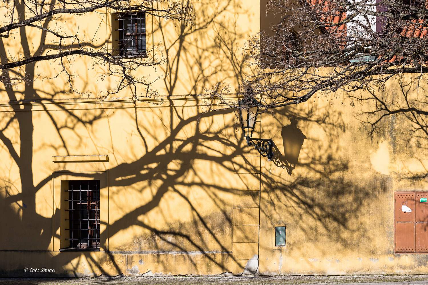 Wir haben von 1988 her noch die Bilder der Reichtümer der Prager Loreto in guter Erinnerung, diese möchten wir bewahren, wie sie sind, also verzichten wir auf einen erneuten Besuch des Heiligtums. Als wir vom langen Laufen pflastermüde auf den Treppenstufen pausieren, genießen wir stattdessen die Frühlingssonnen-Schattenspiele auf den umliegenden Häuserwänden, welche unser Gesamtbild angenehm abrunden.