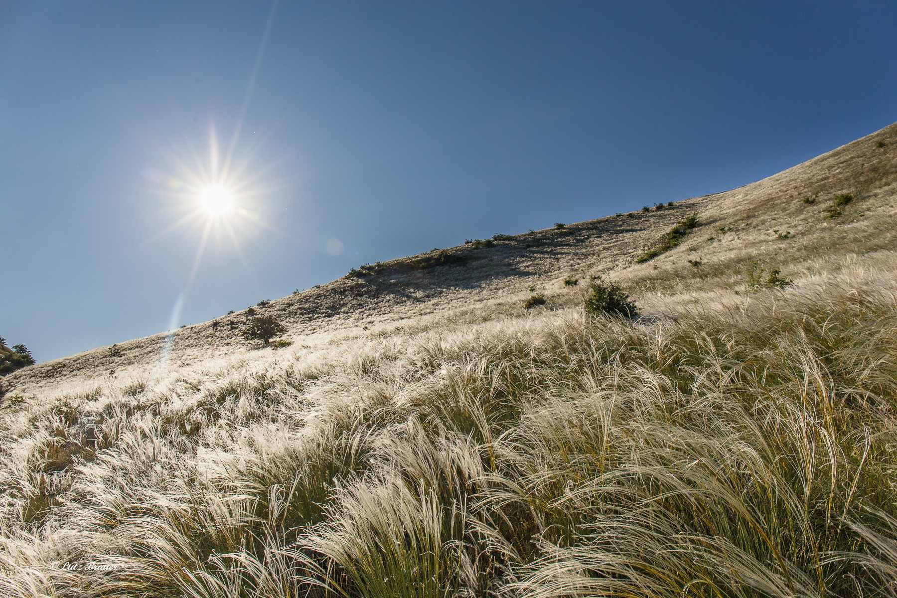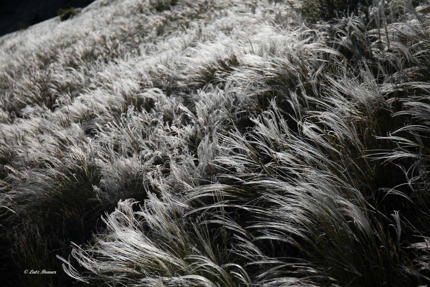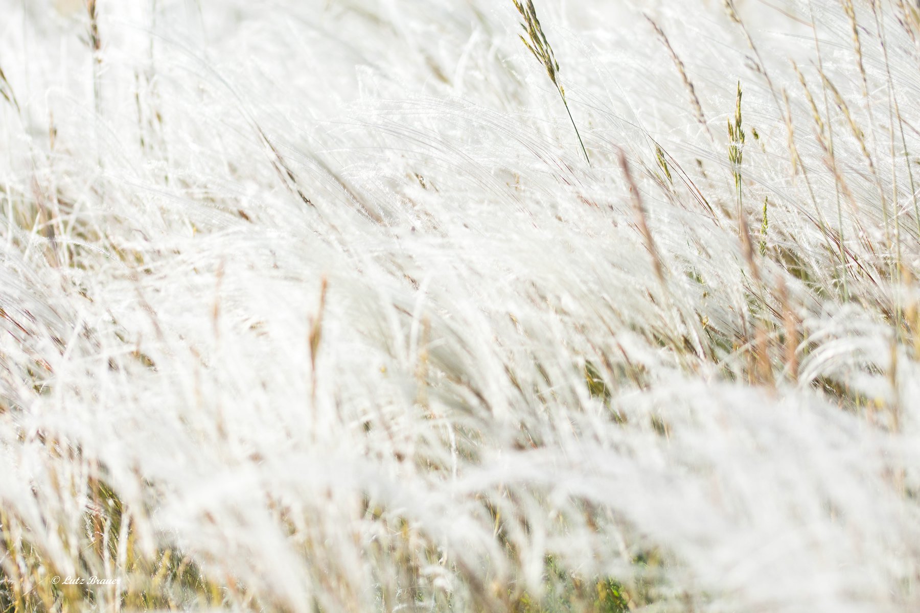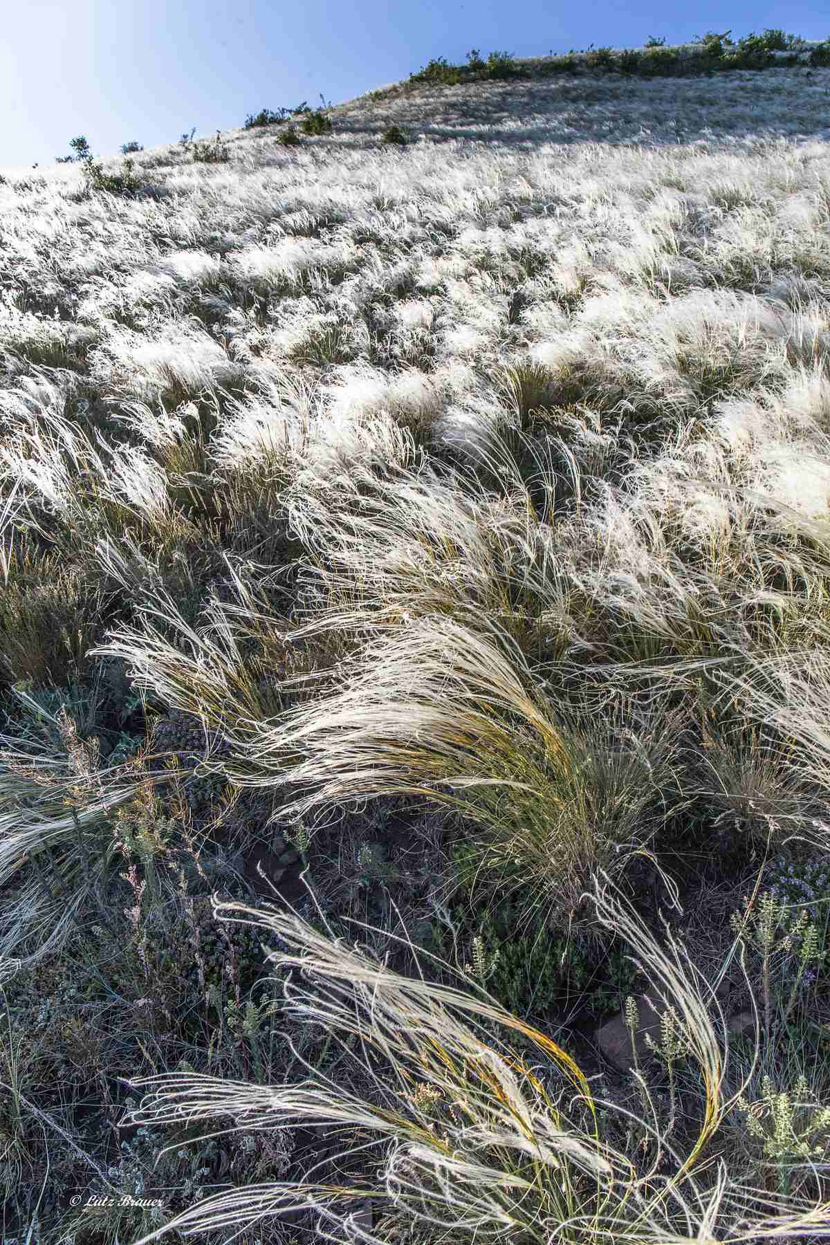 Wir wussten es vorher nicht, nun sehen wir es sozusagen zum ersten Mal, denn genau die kleine Zeitspanne Anfang Juni, in der das Federgras hier blühend ganze Hänge weiß glitzern lässt, haben wir eher unbewusst erwischt.