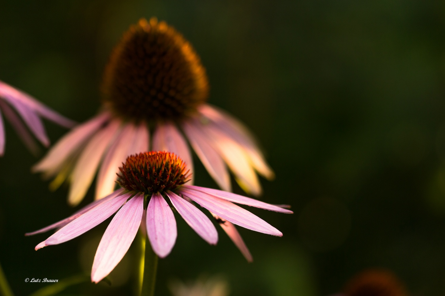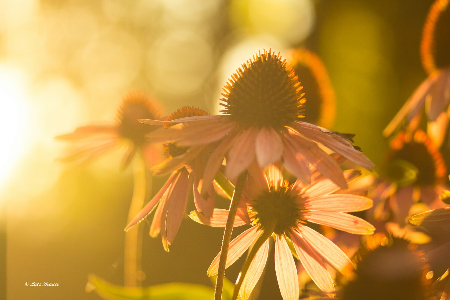 Die Morgensonne steht noch ganz flach über dem Horizont, eine Wolkenbank reflektiert eigenartig deren Licht, es ist ein Rausch des Lichts und der warmen Farben, der da über den Echinaceen entsteht und die erste Euphorie des Tages auslöst.