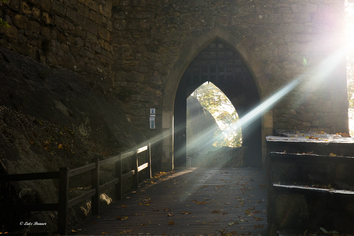 Und da wir zu früher Stunde noch fast allein hier oben sind, erleben wir im richtigen Moment die Sonnenlichter auf dem Friedhof und die märchenhafte Stimmung in diesen altehrwürdigen mächtigen Ruinen.