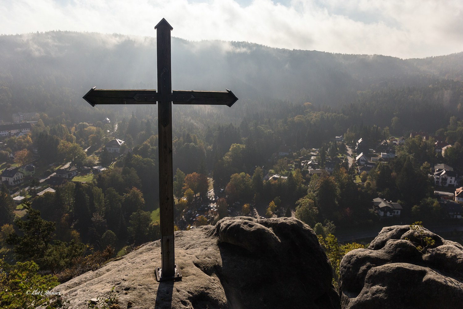 Die Kirche der Klosterruine, die auf einem mächtigen Fels über Oybin thront, war Motiv für C. D. Friedrichs „Huttens Grab“. Wussten wir noch nicht, wieder etwas gelernt, später im entsprechenden Bildband nachgeschlagen – tatsächlich.