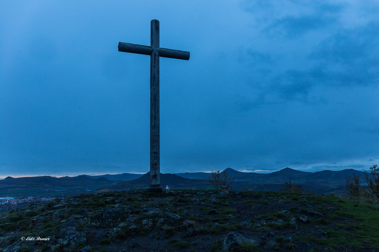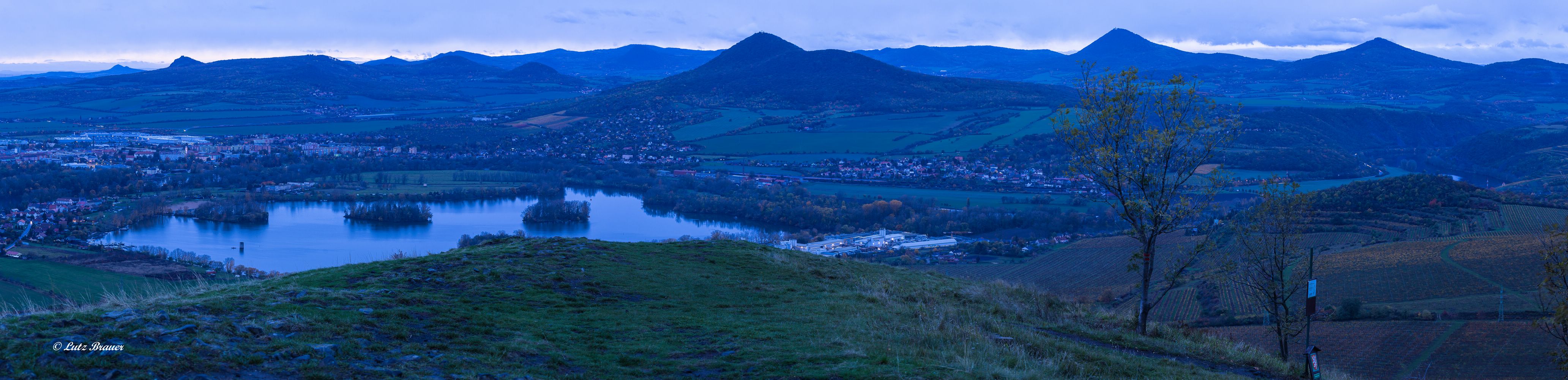 Abends auf dem regennassen Radobýl gönnen wir uns auch noch die Ausblicke in der Blauen Stunde auf die Lichter von Litoměřice und Lovosice, dahinter die Vulkankegel. Egal, selbst im Regen, České středohoří – wir sind (wieder mal) da und sind sozusagen glücklich darüber.​
