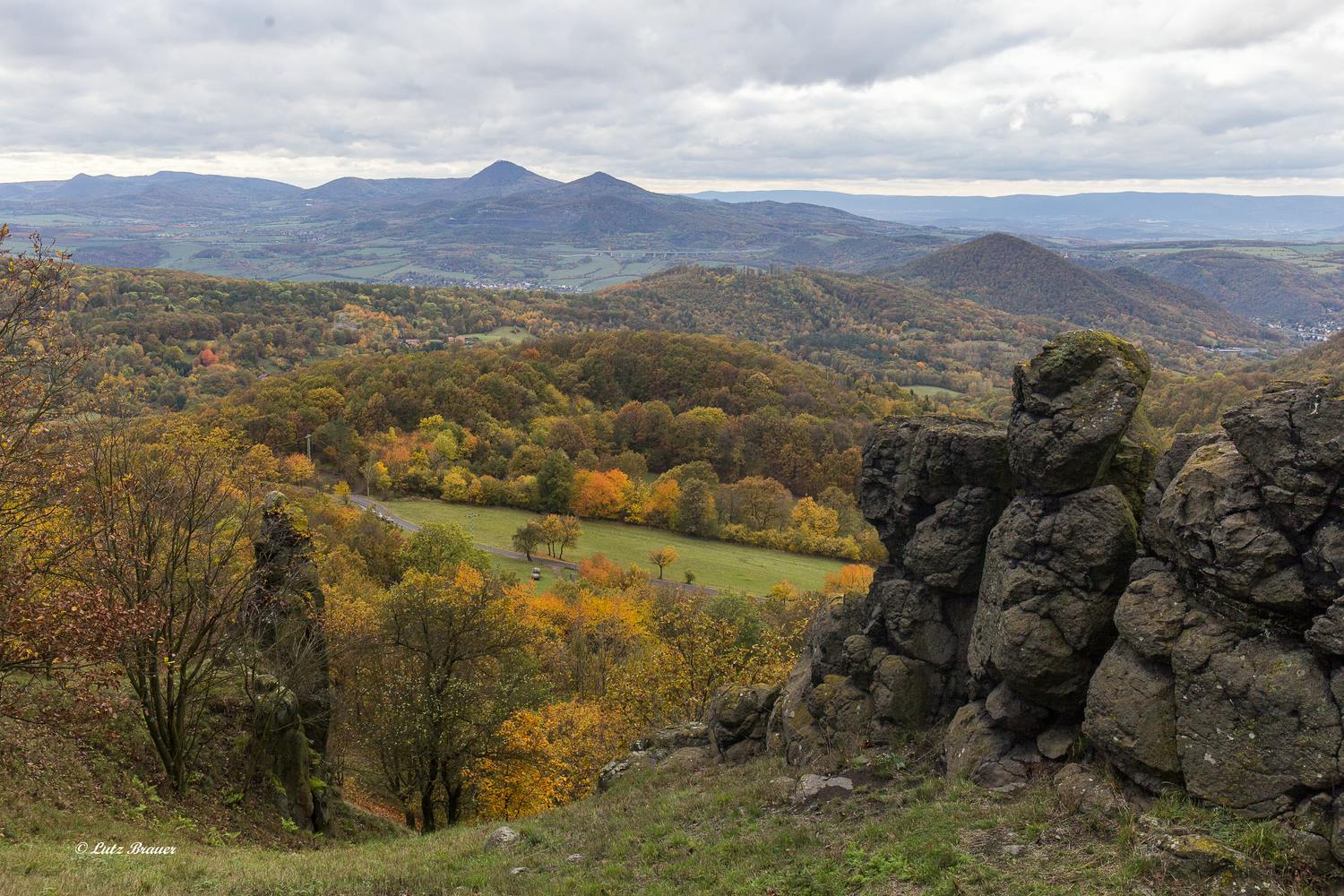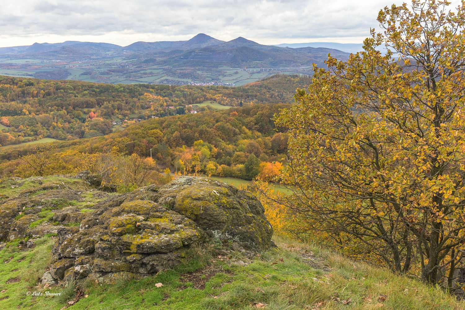 Der Weg von Kundratice, dem ehemaligen Luftkurort hoch in den Bergen über Litoměřice um den Varhost ist zunächst sehr schlammig, führt dann wechselnd durch Buchen- und Eichenwälder hinauf auf den Gipfel mit seinem Aussichtsturm und dem Rundblick übers České středohoří . Erwartungsgemäß sind hier, ein Parkplatz befindet sich ein paar hundert Meter abwärts, einige Leute. Richtig still wird es aber erst, als wir über die Herbstwiesen hinüber zum Holy Vrch/ Lysa Hora mit seinen Felskanten gehen. Das ist ein ganz besonderer Gipfel, flach, mit Wiesen und Sträuchern, im Frühling soll das sehr zu empfehlen sein, wunderschön aber vor allem ist auch der Ausblick auf die böhmischen Ebenen und die Kegelberge des Böhmischen Mittelgebirges aus einer für uns noch recht ungewohnten Perspektive.