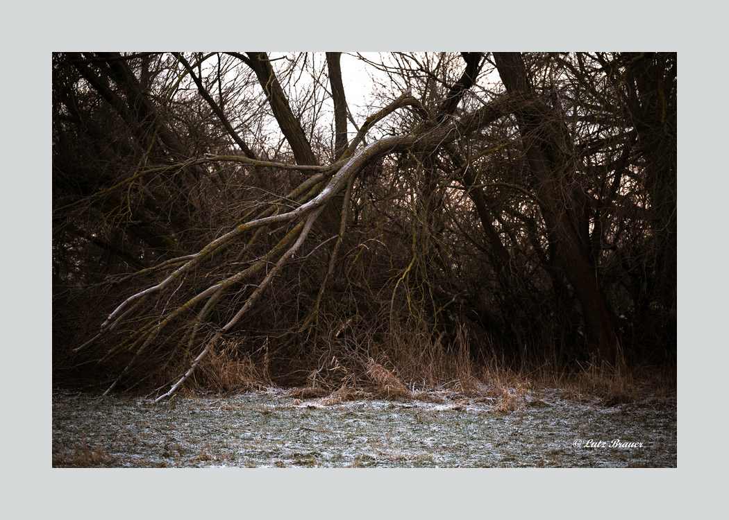 Kriecht man in Winterzeiten gelegentlich durchs Unterholz, bricht man mit den Schuhen dabei durchs fester geglaubte Eis tiefer Pfützen und weicht sich dabei gründlich die Füße ein, schreckt man (leider) Eisvogel und Fasan aus der Abendruhe und wundert man sich, dass der Baum, der doch letztes Jahr noch so mächtig und stabil stand, nun eine Ruine ist, kann man durchaus feststellen, dass die Jahreszeit doch nicht so finster ist, wie beim Blick aus dem warmen Zimmer durchs Fenster befürchtet.