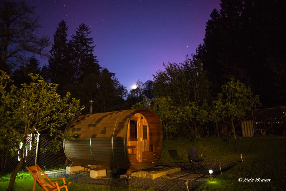 Die Idee, nachts noch einmal spontan hinaus zu gehen und „unser“ idyllisch im tiefen Waldtal befindliches Häuschen unterm Sternenhimmel zu fotografieren, ist völlig spontan. Einerseits aus dem Antrieb heraus, ein von diesem Ort noch nie gemachtes Foto zu kreieren, andererseits aus dem Grund, Stativ und den ganzen anderen Kram nicht völlig umsonst hierher mitgenommen zu haben, steht der uHu halb elf im dunklen Wald und lichtet das Häuschen und sein Drumherum ab. Noch ein Blick nach oben zum Sternenhimmel, der nur begrenzt zwischen den Baumwipfeln sichtbar ist und wieder hinein. Es ist empfindlich kühl hier draußen.