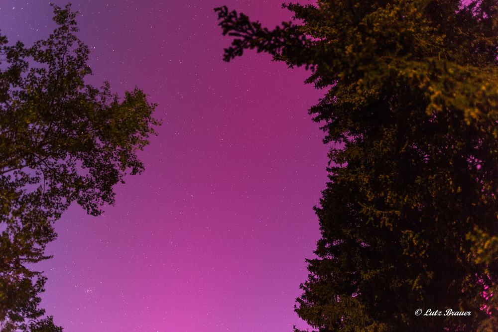 Was ist das hier in Tschechien für ein merkwürdiges Licht, lila, rosa, rot. Das verschmutzt den ganzen Himmel! Die Lichtglocken der benachbarten Gemeinden sind doch eher gelblich-orange!