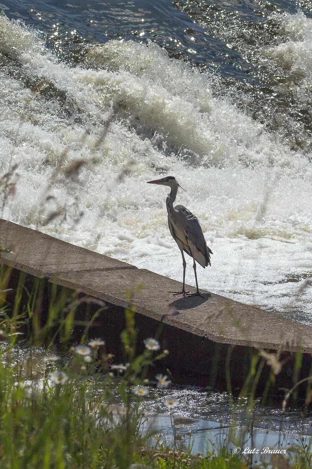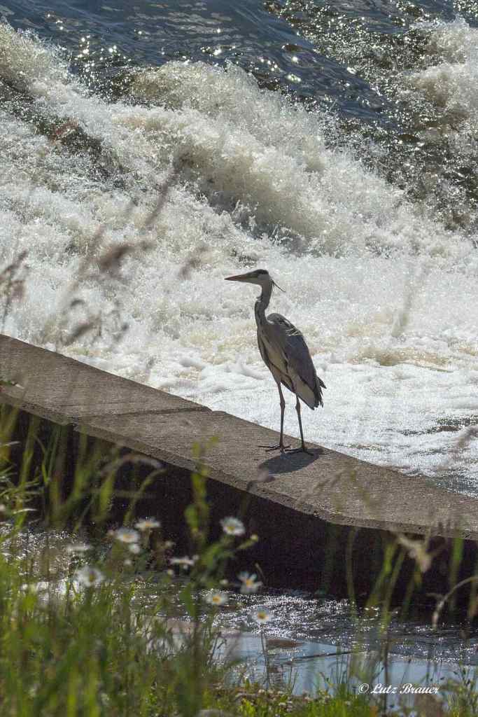 Der beobachtende Jäger vor dem großen Mulde-Wehr wurde zufälligerweise selbst (von uns) beobachtet, ließ sich aber dadurch nicht im Geringsten stören.