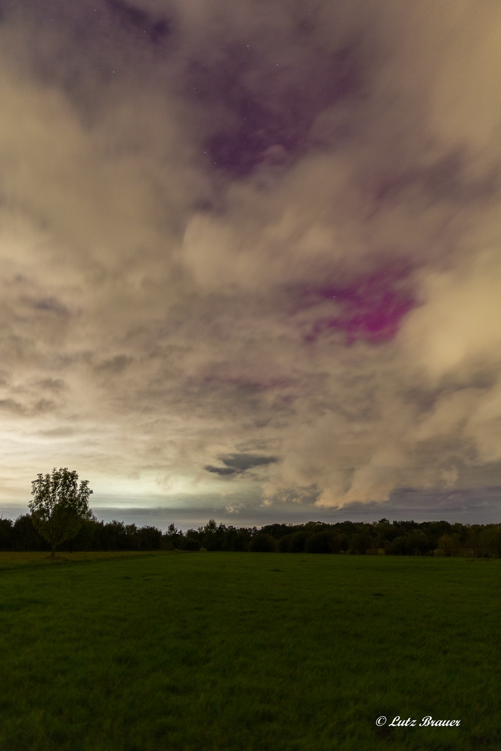 In der Hoffnung auf eine Wolkenlücke findet sich der uHu pünktlich zur prognostizierten Zeit auf den Wiesen am Flüsschen ein, dort hat man einen recht offenen Blick in Richtung Norden/ Nordwesten. Aus den skandinavischen Erfahrungen weiß man nun auch, dass Polarlichter nicht unbedingt mit dem bloßen Auge sofort identifizierbar sind. Also Blende auf, 1,4 weiter geht nicht, ISOs hoch – 800 reichen erst einmal, der Himmel ist wegen der Lichtverschmutzung recht hell und dann ein paar Probeaufnahmen gemacht. Der weißgraue Streifen dort… Nö, das ist nur eine angeleuchtete Wolke, es gibt leider, sehr bedauerlich, nur wenige Wolkenlöcher, die sich bald wieder schließen.