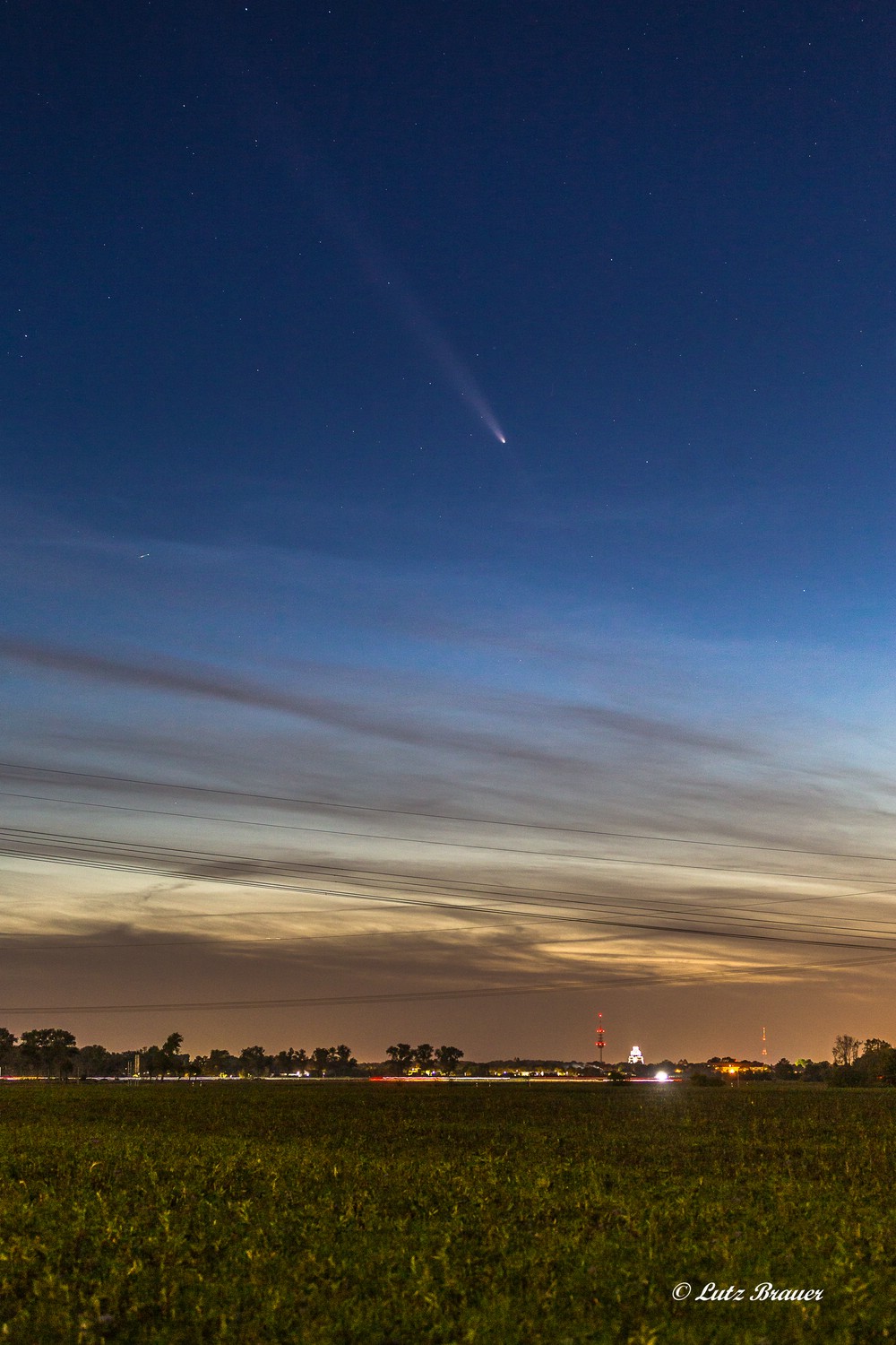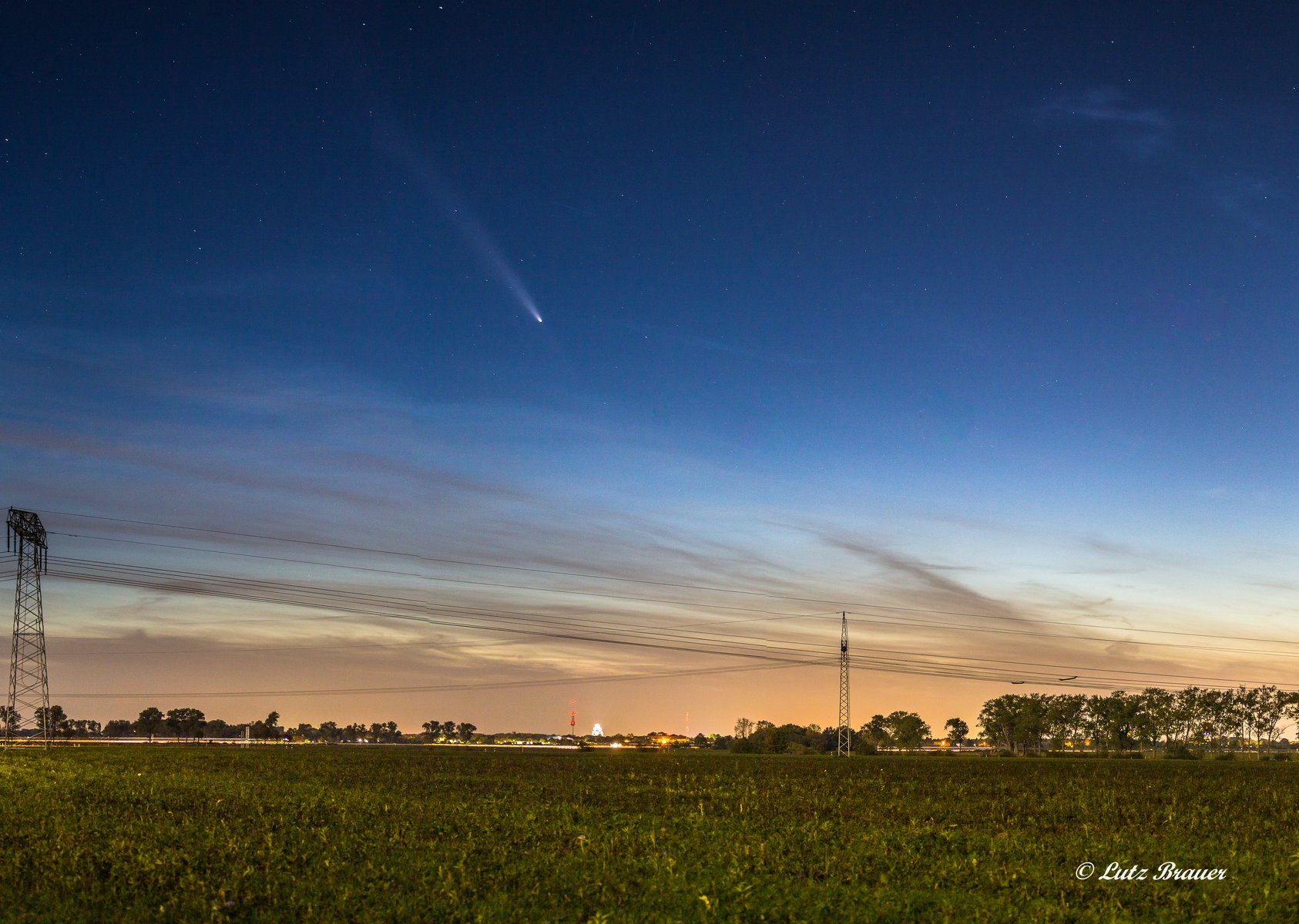 Ehrlich gesagt, war es kaum zu glauben, nach Neowise 2020 schon wieder einen solch großen Kometen mit bloßem Auge am Abendhimmel kurz nach der Dämnmerung im Südwesten zu sehen. Wie ein verwaschener Stern mit blassem Flugzeugkondensstreifen schaut er aus, die Kamera sieht natürlich wieder viel mehr, als unsere unvollkommenen Augen. Und speziell für die eigenen Aufnahmen bietet das illuminierte Völkerschlachtdenkmal fast direkt unter dem Kometen noch einen weiteren Hingucker.