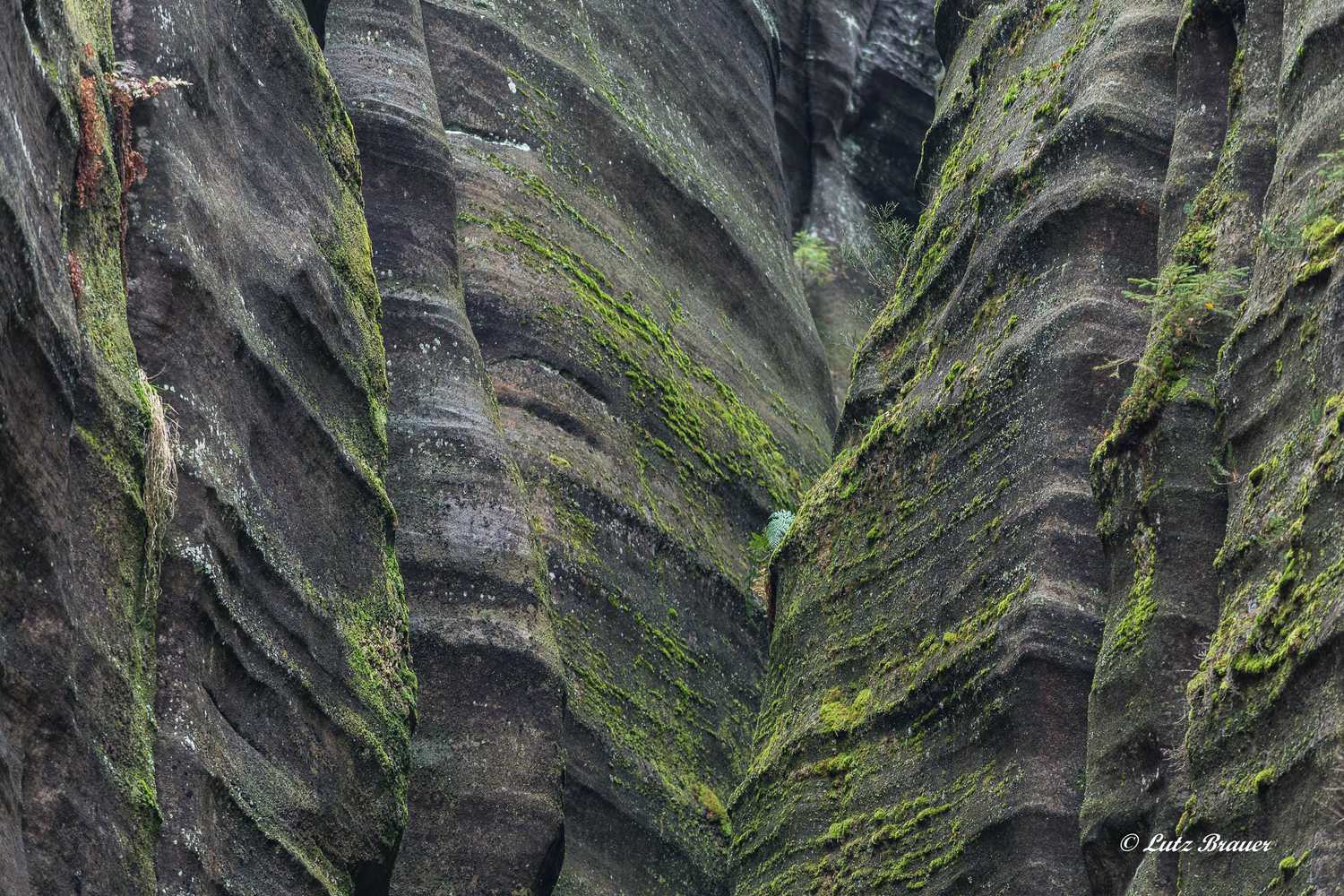 Und dann taucht man durch das gotische Tor, welches 1839 errichtet wurde, in eine grün bemooste Wunderwelt ein, viele Meter hohe Felswände bedrängen den Wanderer in dieser labyrinthartigen Schlucht. Wie oft bleibt man hier jetzt stehen, um diese oder jene besondere Form des Felsens, die Anordnung der Moospolster, das immer wieder von Neuem überraschend eigenwillige Licht auf die Speicherkarte zu bannen.