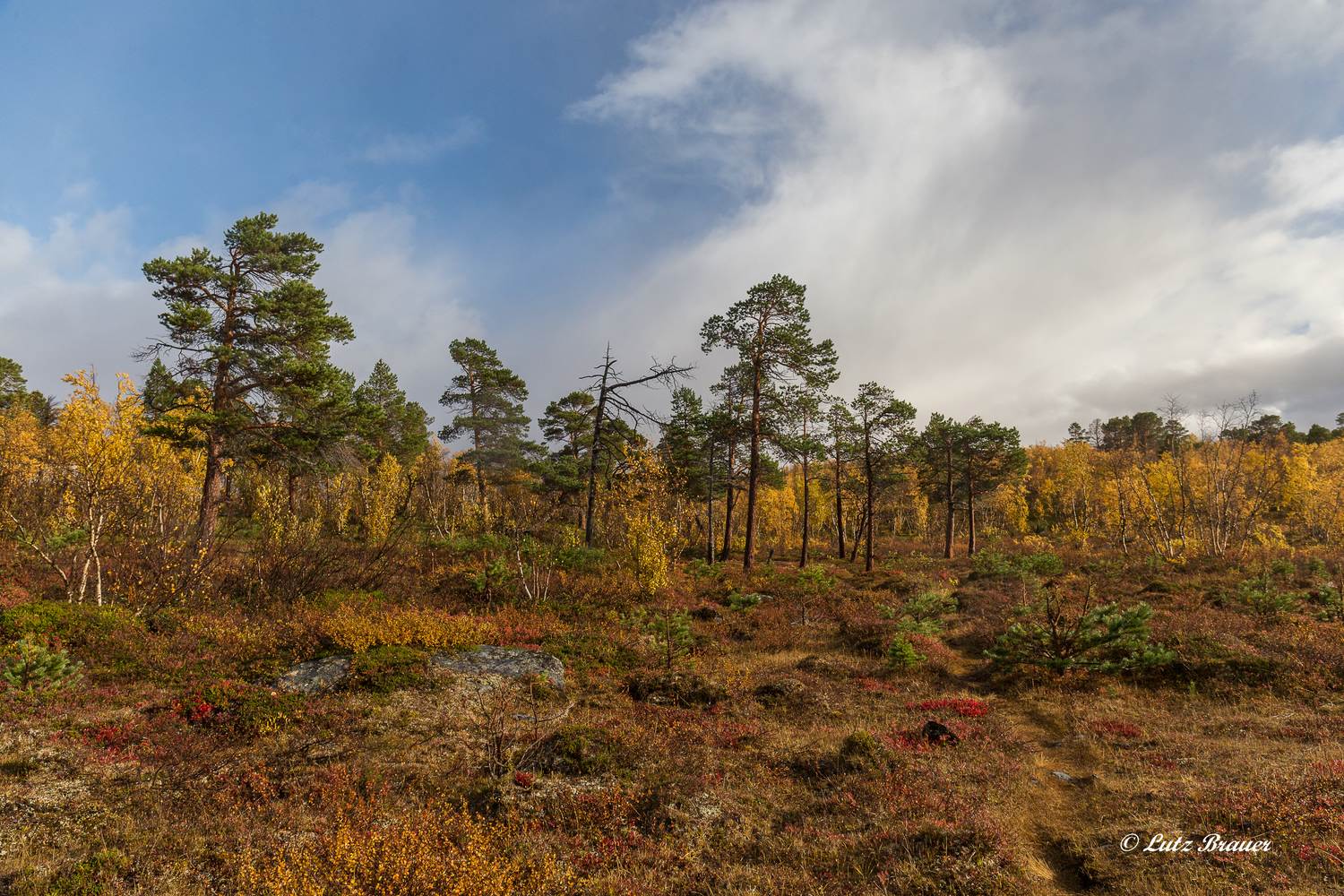 Eben noch regnete es heftig, jetzt brechen die Wolken auf, die Sonne glitzert auf dem nassen goldgelben Laub der niedrigen Birkenwälder. Ein Fest der Farben ist das, unten glänzt der soeben tiefblaue See, im Dunst und Wolkenschleier jenseits ahnt man schneebedeckte Gipfel. Und das Lapporten grüßt jetzt weniger bedrohlich herüber.