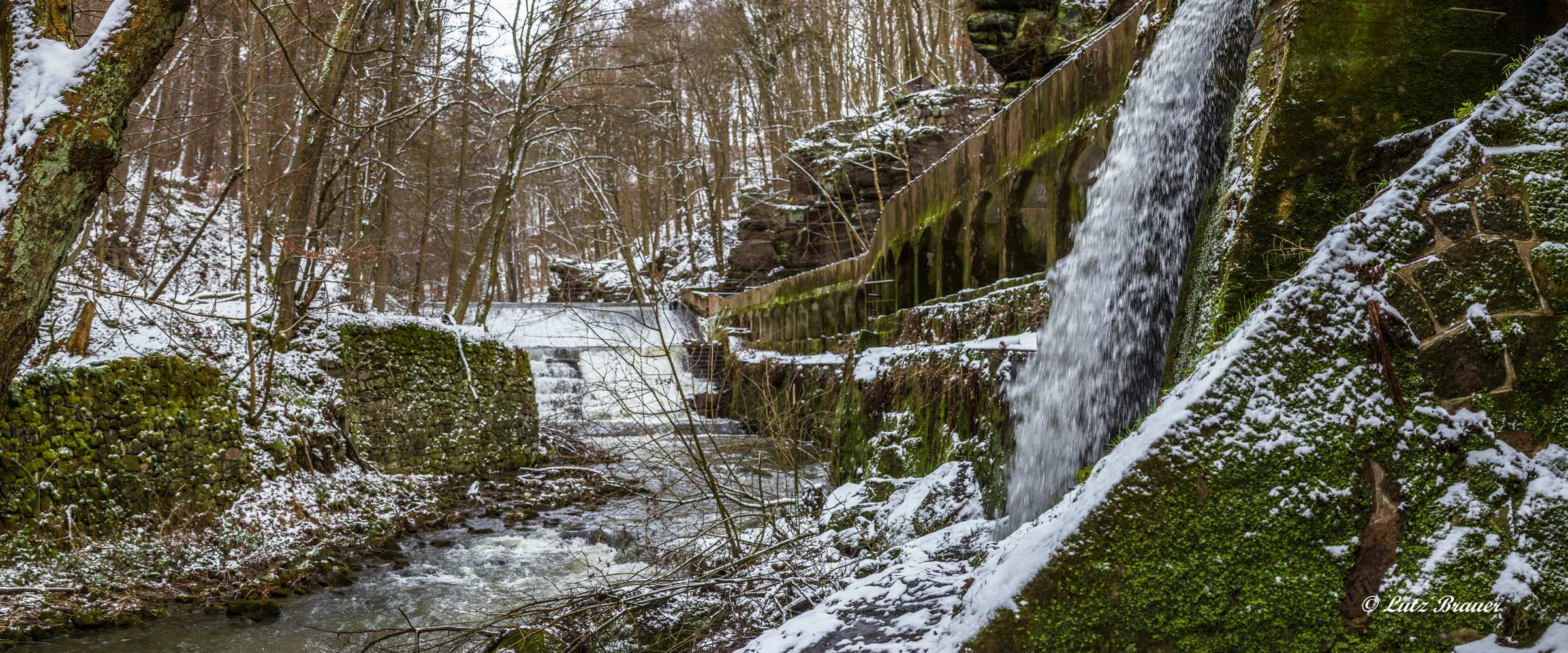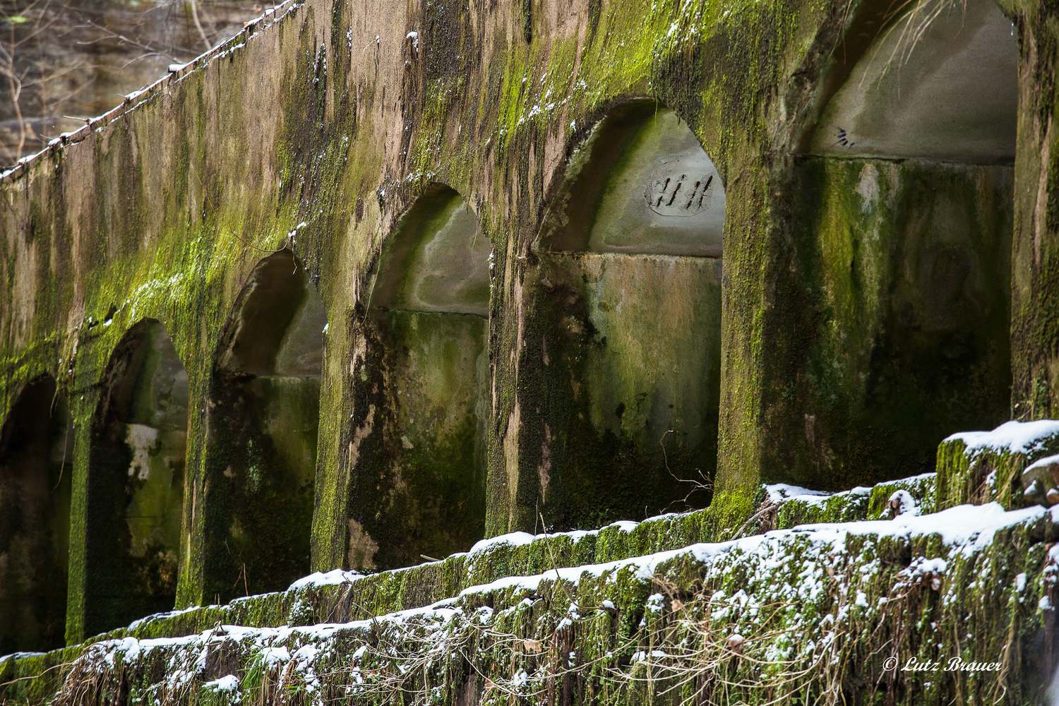 Bei Lohmen geht es kurz über die Höhe, dann aber können wir noch einmal ins dämmrige Waldtal hinab, es ist nicht mehr ganz so felsig und dramatisch wie zu Beginn, aber dafür entecken wir im alten Wasserwerk im Niezelgrund einen wirklich verwunschenen verlassenen Platz. Obwohl erst seit den 60er-Jahren im letzten Jahrhundert aufgegeben, hat man doch den Eindruck, dass die Natur hier ganz emsig daran ist, menschliche Spuren zu tilgen.