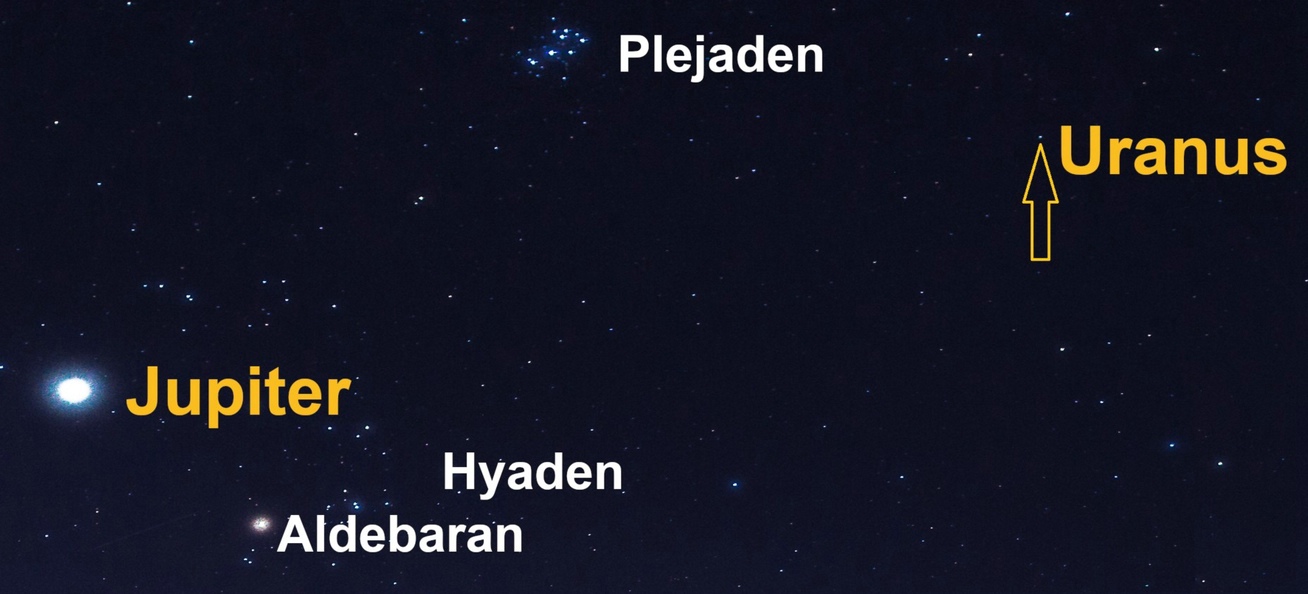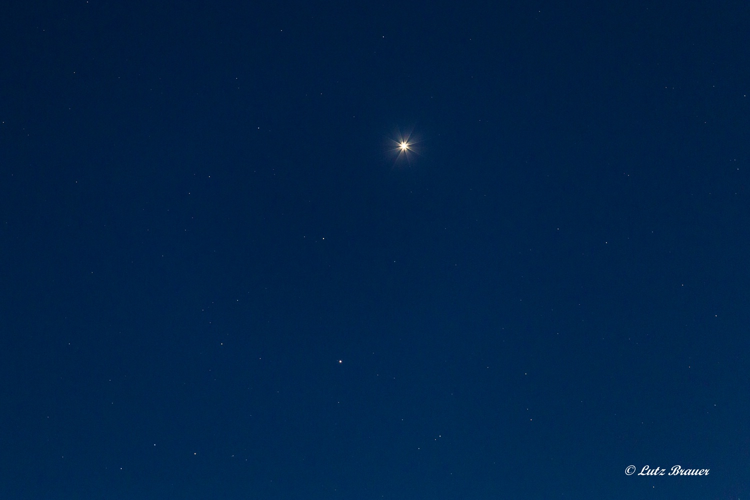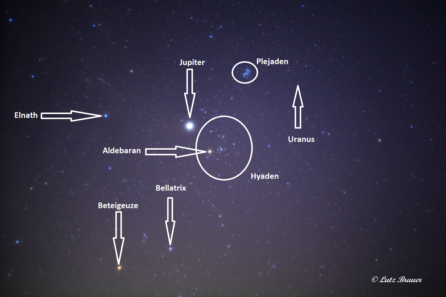 Bei Jupiter gibt es keine Frage, in der Kombination mit dem recht nahen „Weihnachtsbaum“ der blau leuchtenden Plejaden, dem hellen rötlichen Aldebaran und dem schönen Sternenhaufen der Hyaden ist er in dieser Himmelsregion bei Weitem der Hellste und Strahlendste.
