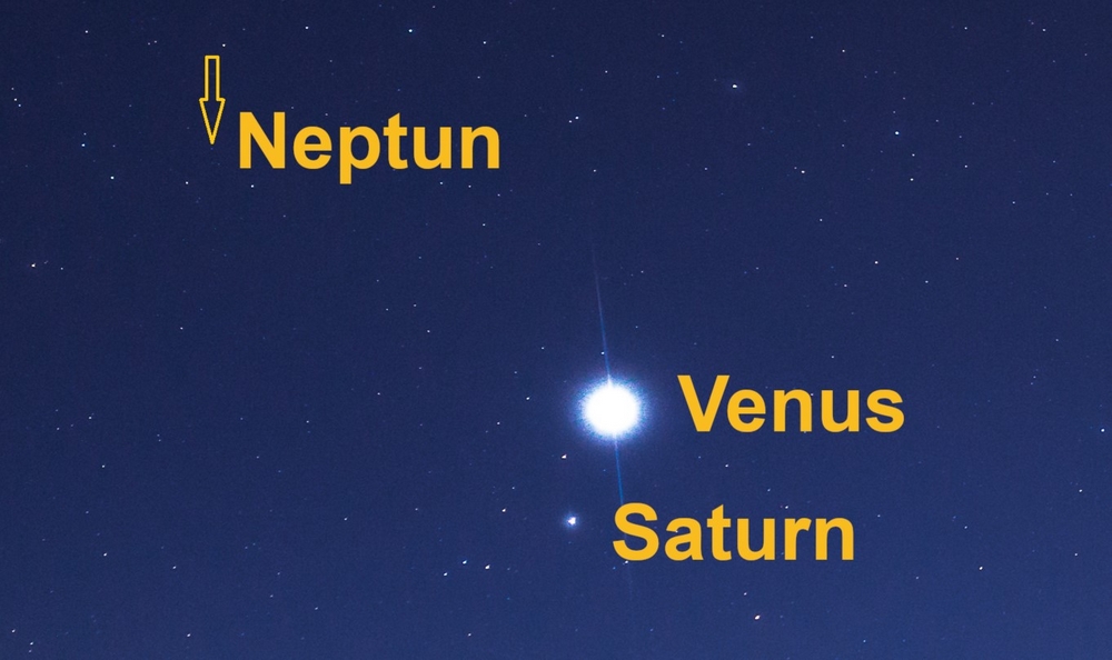 Aber nun zu den wesentlichen Dingen des Lebens. Die Dämmerung nähert sich ihrem Ende, im Südwesten strahlt Venus ganz hell, auch Saturn ist etwas horizontnäher sehr deutlich auszumachen. Etwas weiter südlich, höher stehend, soll sich Neptun befinden. Mit bloßem Auge oder auf dem Display ist das nicht zu erkennen.